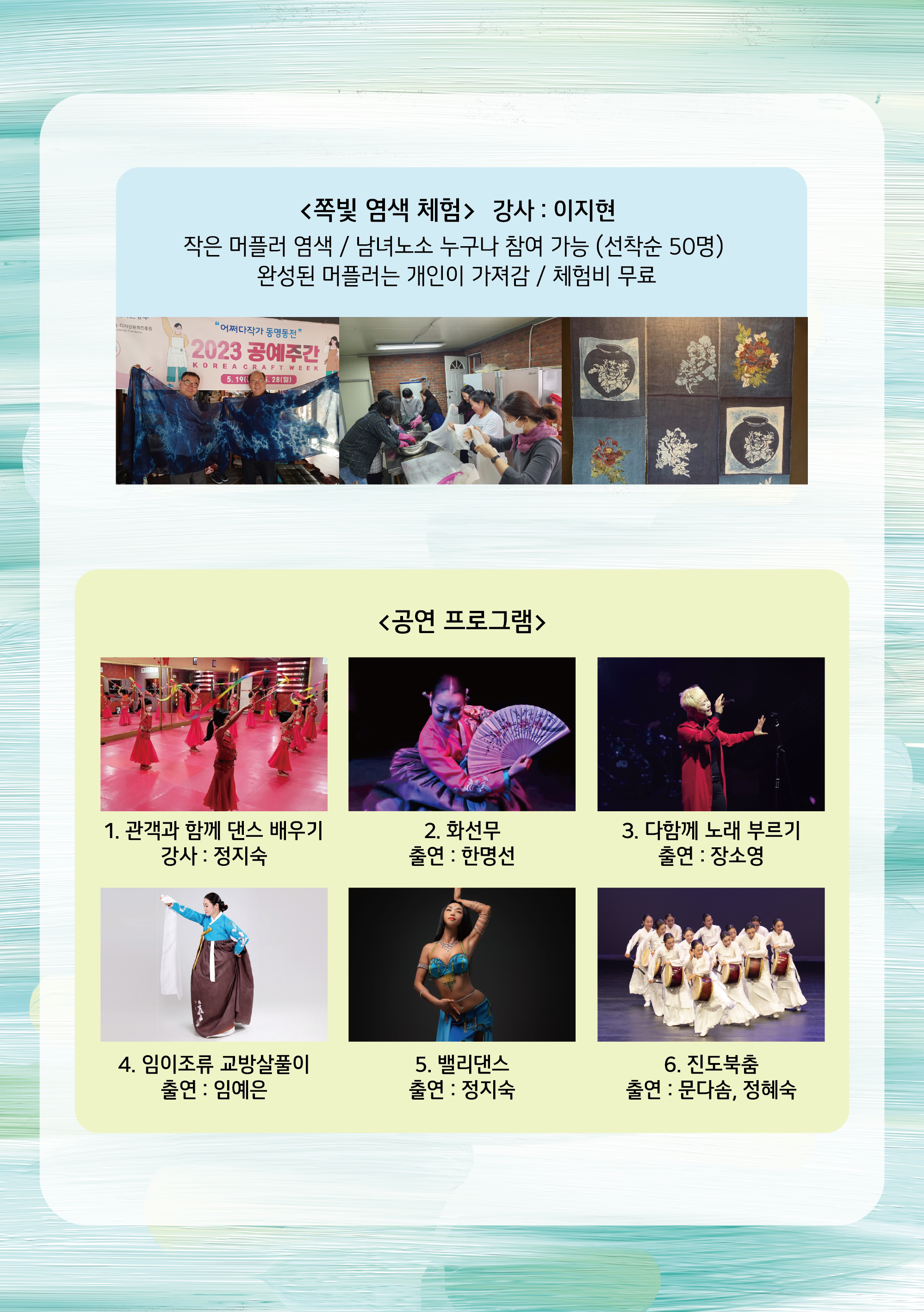 <다함께 차차차> - 공연일시 : 2023. 7. 9. 일 12:30 - 공연장소 : 진도무형문화재전수관 야외마당 - 공연내용 : 염색체험 및 공연 *염색체험은 선착순 50명으로 제한하여 진행됩니다. - 공연문의 : 010-5148-8528