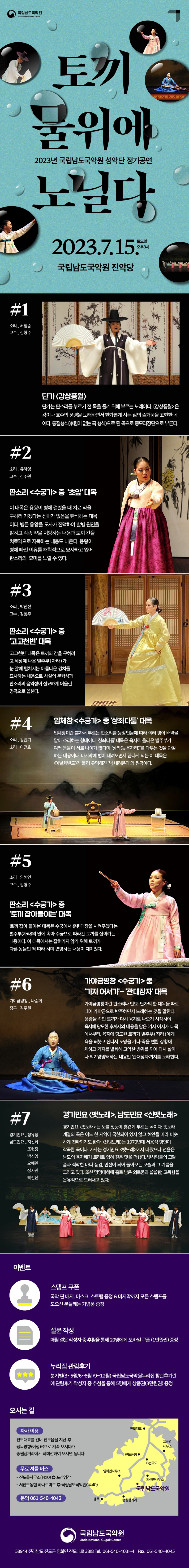 7월 세 번째 공연은 국립남도국악원 성악단 정기공연 “토끼 물 위에 노닐다”입니다.