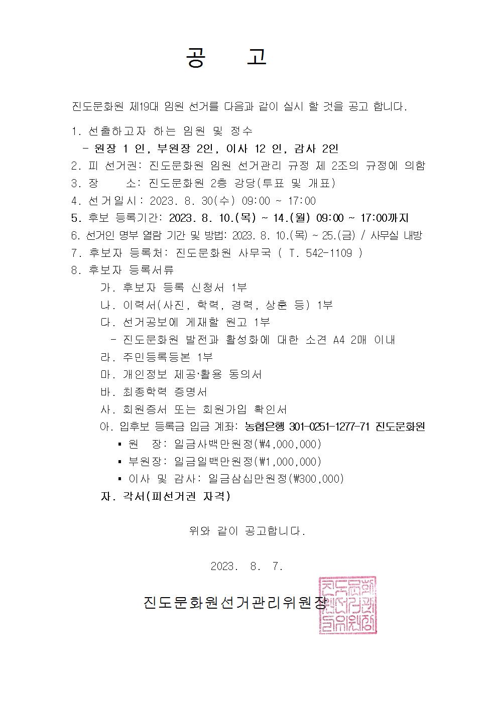 ※ 후보자 등록에 필요한 기본 서식은 진도문화원 홈페이지 공지사항에 있는 첨부 파일을 반드시 다운 받아 사용바랍니다. ※ 후보자 등록 서류에 '자. 각서(피선거권 자격)'가 추가되었습니다.