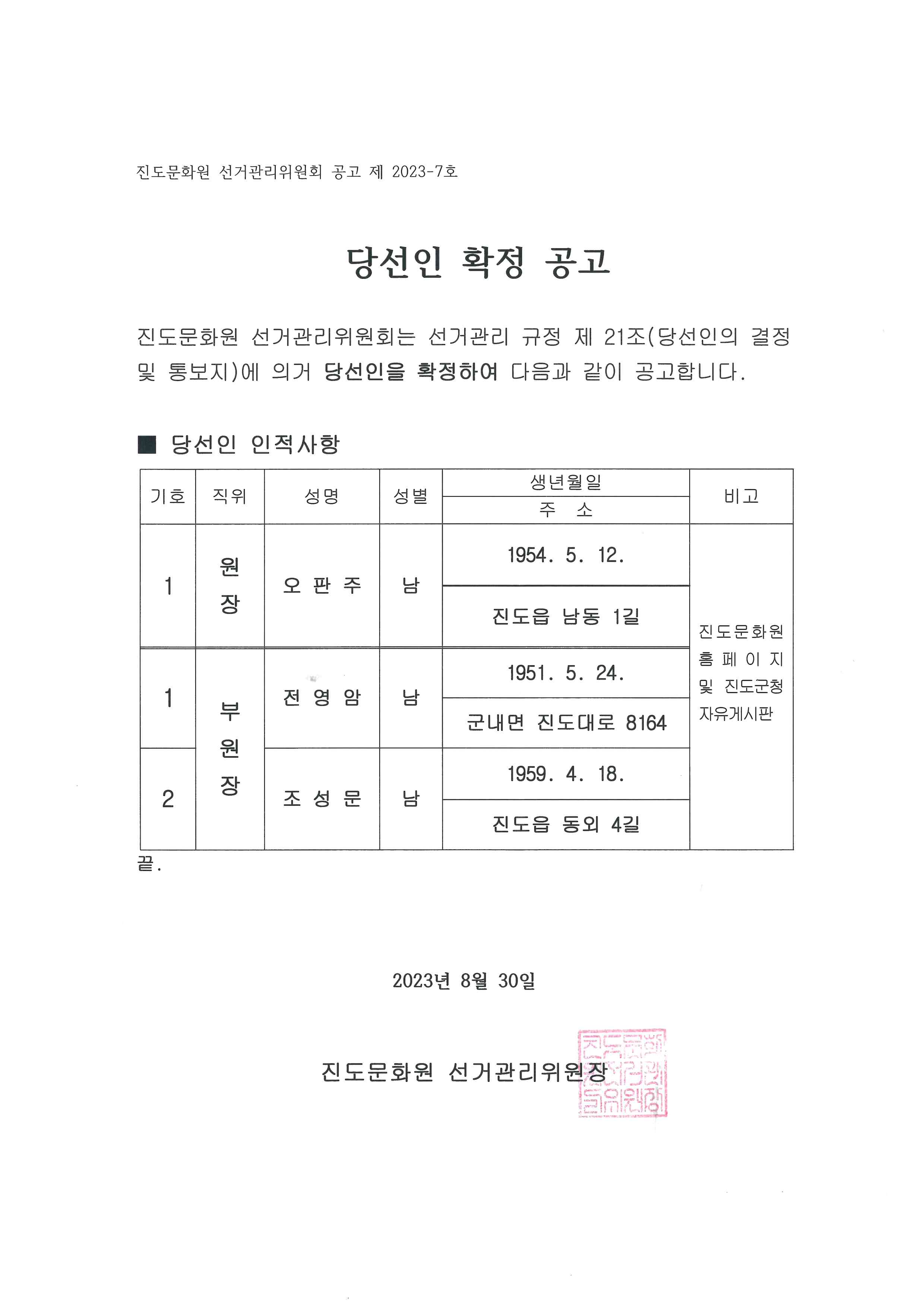 진도문화원 제19대 임원(원장, 부원장) 당선인 공고
