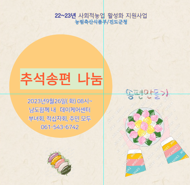 추석을 맞아 송편 나눔을 통해 지역민들과의 훈훈한 명절을 보내시려는 손길들을 모은 행사입니다. 송편도 빚고 나눔도 하며 풍성한 한가위가 되었으면 합니다. 많은 참석 바랍니다.- 준비물 없음( 몸 만 오시면 됩니다) 문의처: 사회적협동조합 남도함께 010-2011-6742