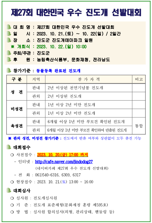 제27회 대한민국 우수 진도개 선발대회를 다음과 같이 개최하오니 많은 관심과 참여를 바랍니다.