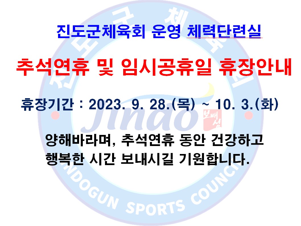 진도군체육회 운영 체력단련실 추석연휴 및 임시공휴일 휴장안내