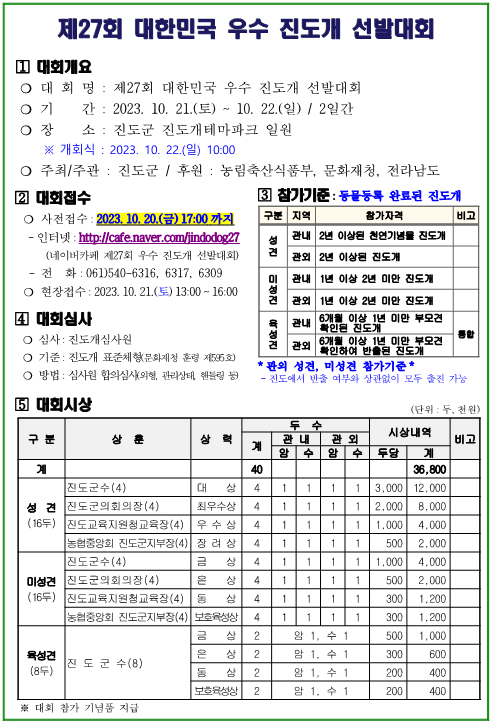 제27회 대한민국 우수 진도개 선발대회를 다음과 같이 개최하오니 많은 관심과 참여를 바랍니다.