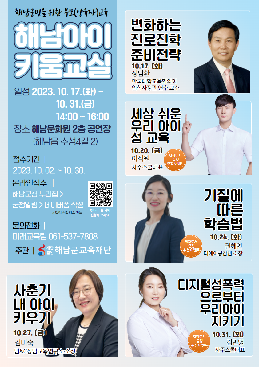 해남군교육재단에서는 부모(양육자)교실 ‘해남아이키움교실’ 강좌를 개최합니다.
