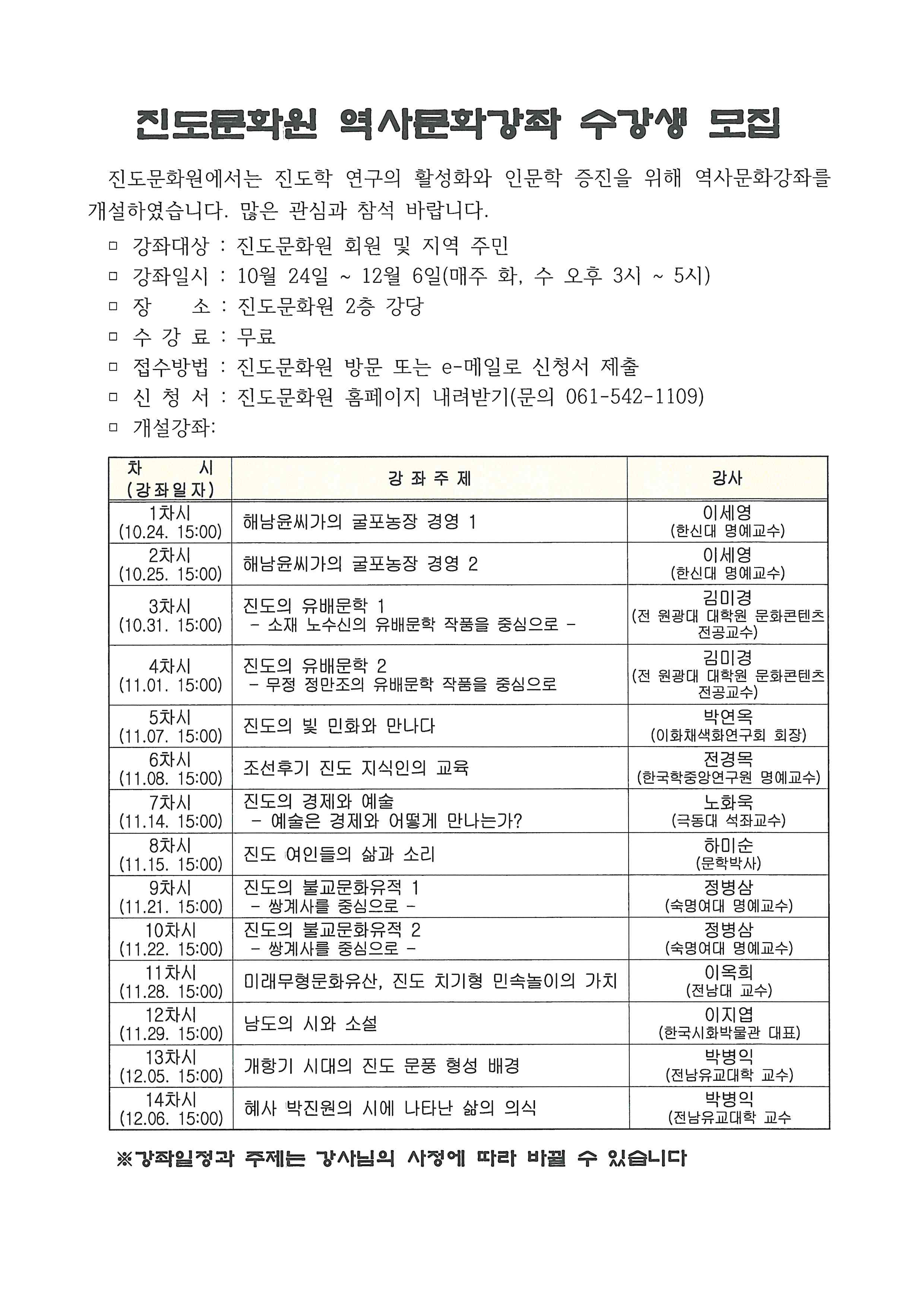 진도문화원 문화학교 역사문화강좌 수강생모집
