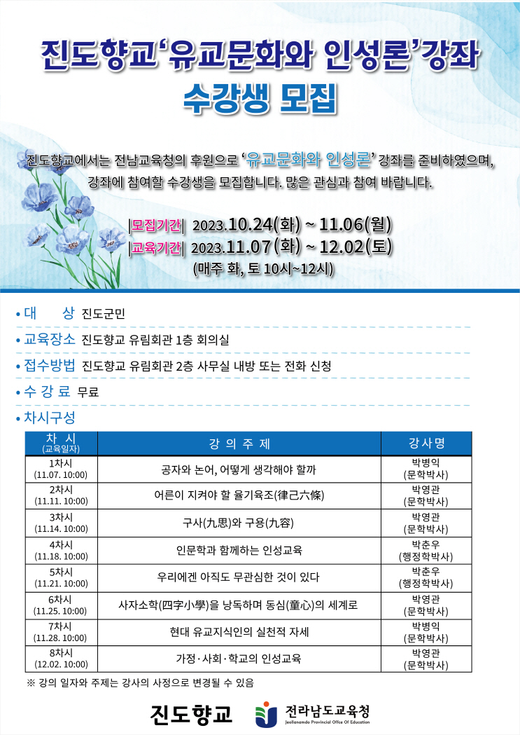 진도향교 유교문화와 인성론 강좌 수강생 모집 안내