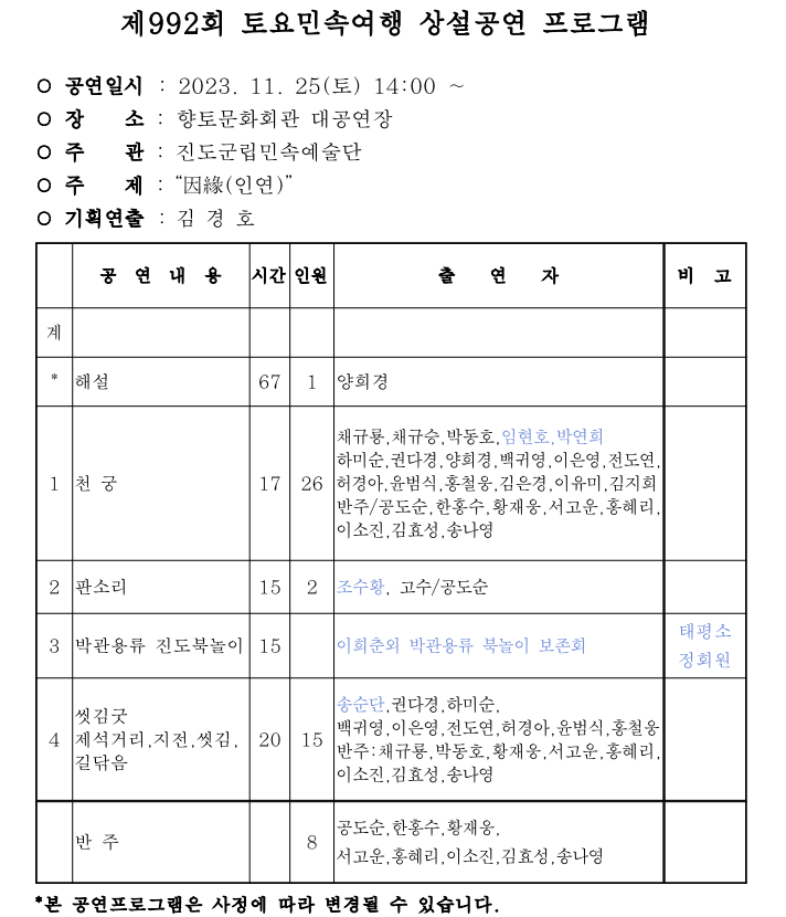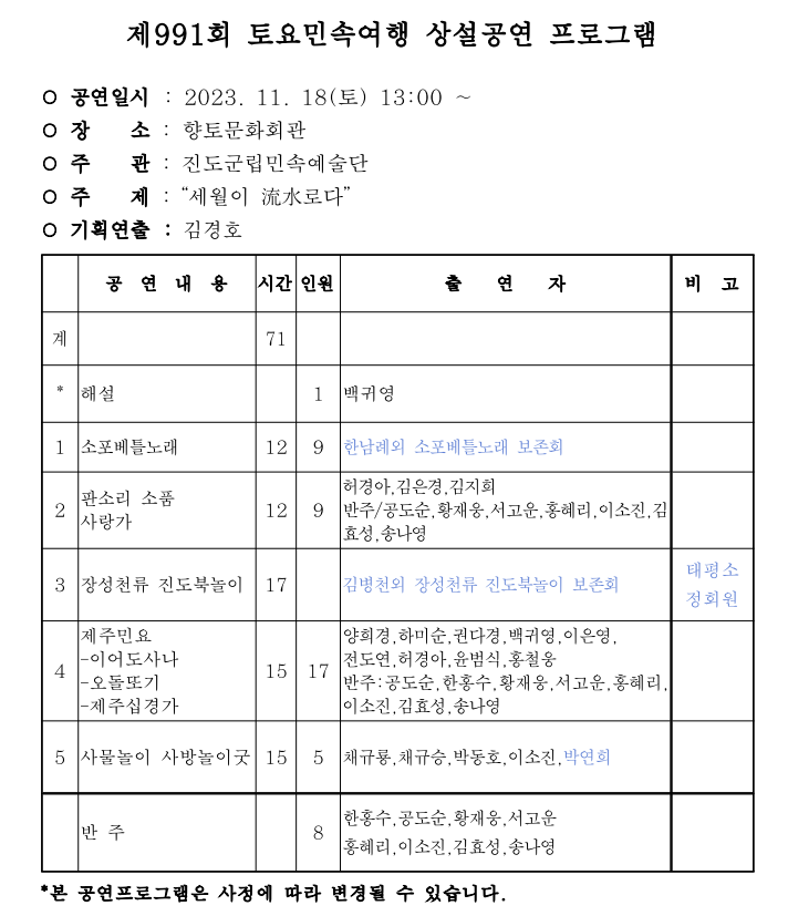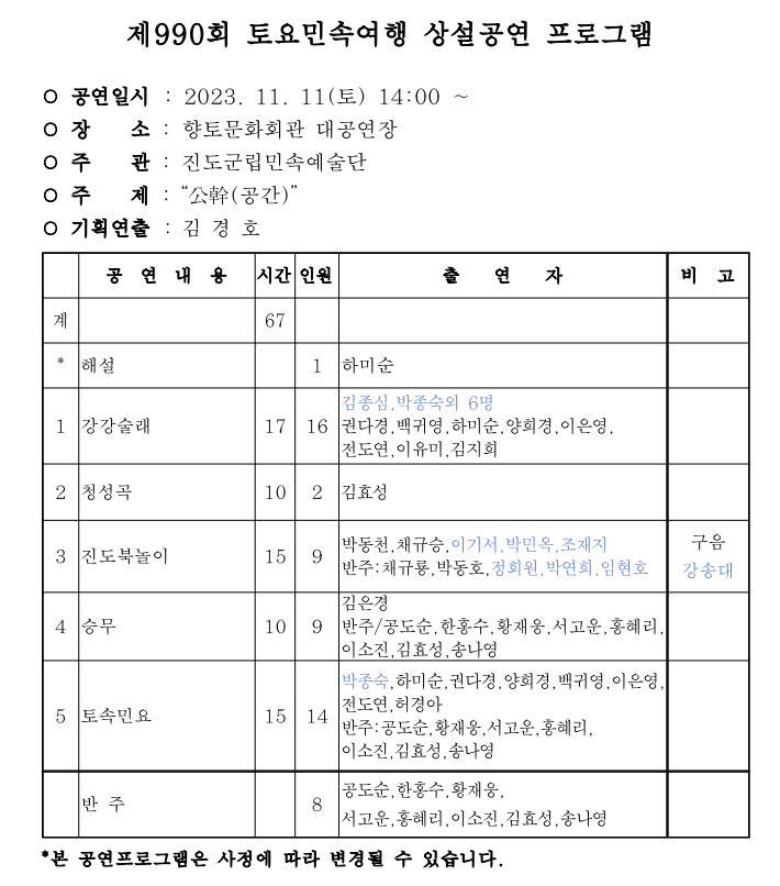 ※ 11월 4일은 진도군 보배섬문화예술제 개최 관계로 공연이 진행되지 않습니다.