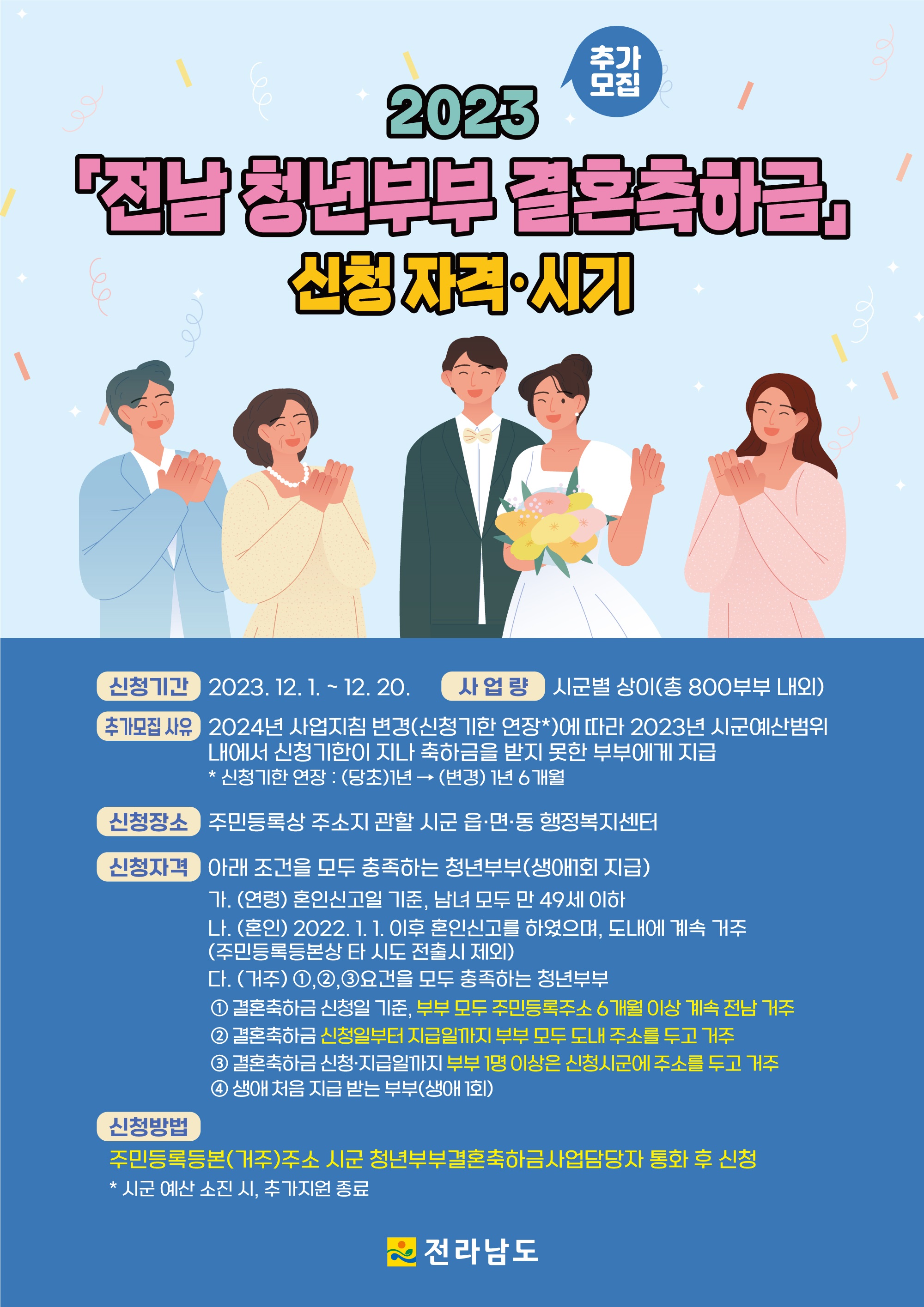 2024년 청년부부 결혼축하금 신청기한 연장(당초:혼인신고일 기준 1년 → 변경: 1년 6개월 이내 신청)에 따라 2023년 청년부부 결혼축하금 지급을 받지 못한 부부에게 지급하고자 하오니, 붙임의 배너를 참고하시어 해당 청년부부께서는 신청하여 주시기 바랍니다. 문의는 진도군청 인구정책실 ☎540-3818로 문의 바랍니다.