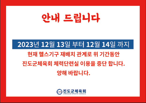 진도군체육회 체력단련실 헬스기구 재배치 안내문