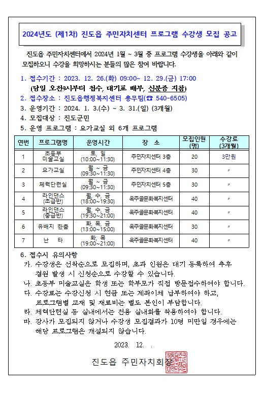 진도읍 주민자치센터에서 2024년 1월 ~ 3월 중 프로그램 수강생을 아래와 같이 모집하오니 수강을 희망하시는 분들의 많은 참여 바랍니다.