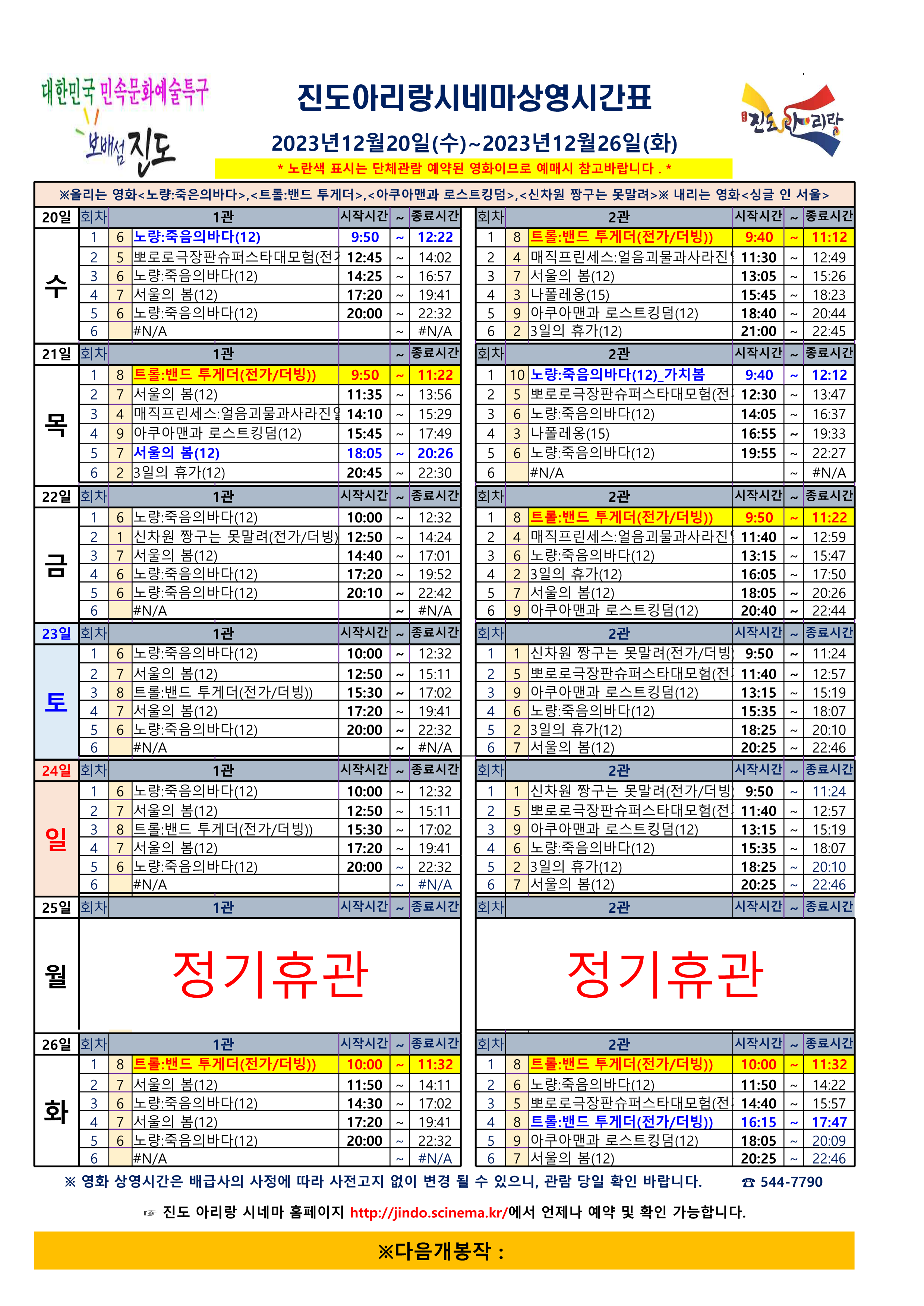 진도아리랑시네마 상영스케줄(2023.12.20(수)~12.26(화)) 안내드립니다.