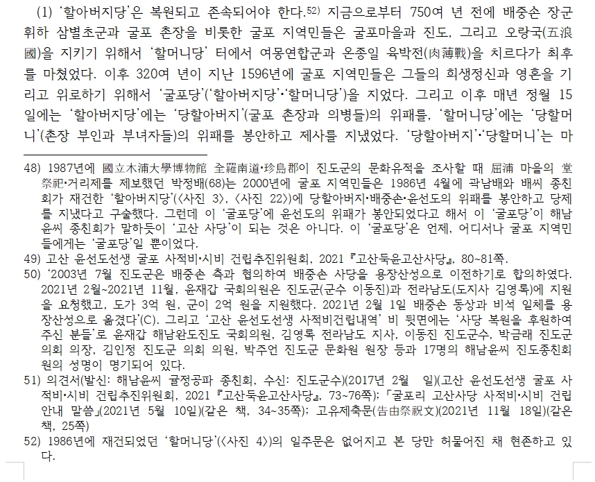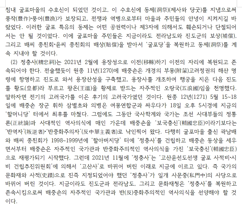 그런데 '굴포당=배중손당'이라는 결론을 내리까지 무슨 '논증'을 하셨다는데, 이 원고에서 논증의 증거물(나머지는 연구자의 일방적 주장)은 '굴포신당유적비'이고, 그 유적비문을 근거로 해서 세워진 게 정충사인데, 이 내용들은 이미 재판까지 가서 결론이 난 거 아닌가요? 굴포당제를 지내는 주민들을 찾아가서 현장 설문을 하셨는가요? 윤씨집안도 아닌 사람들이 면사무소, 군청까지 찾아가서 항의하고 데모한 내력은 직접 들어보셨습니까? 문화재 만들려고 없는 사실 만들어서 비를 세웠으나, 주민들의 반발로 끝내 성공하지 못한 굴포판 삼별초 쿠데타......얼마나 주민들이 양심의 가책을 느꼈을까요? 더구나 당을 모시는 분들이었는데. 현장에 답이 있다했지요. 제 생각에는 굴포 남선 신동 마을 한나절만 돌면, 지금 주장하시는 게 너무나 작위적이구나 하시는 걸 느끼실 겁니다.