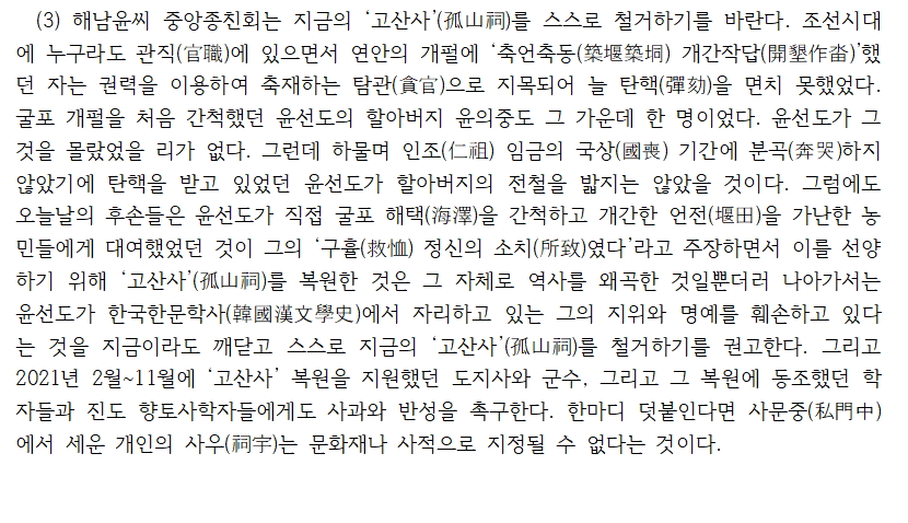 당파싸움으로 왜곡된 실록들 들춰봐야 그게 부메랑되어 논리적으로만 궁핍해집니다. 얼마나 우스운 이야기입니까? 언전 개발했다고 탐관으로 표적이 되어 '평생' 탄핵되었다는 논리가요. 윤선도가 효종, 현종 때 수없이 벼슬을 내려도 거부한 것 때문에 오히려 표적이 된 점들은 안 보이시나 봅니다. 왕명 거절 하면 삼족을 멸하던 시기에요. 정말 아전인수식 해석인 거 모르시나 봅니다.