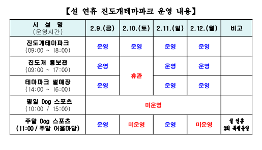 • 설 명절 진도개테마파크 시설 운영 사항을 다음과 같이 안내합니다.
