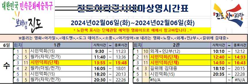 진도아리랑시네마 2024.02.06(화) 스케줄 변경안내드립니다. 단체 관람으로 인하여 상영스케줄 변경되었으니 영화 예매시 차질 없으시길 바랍니다.
