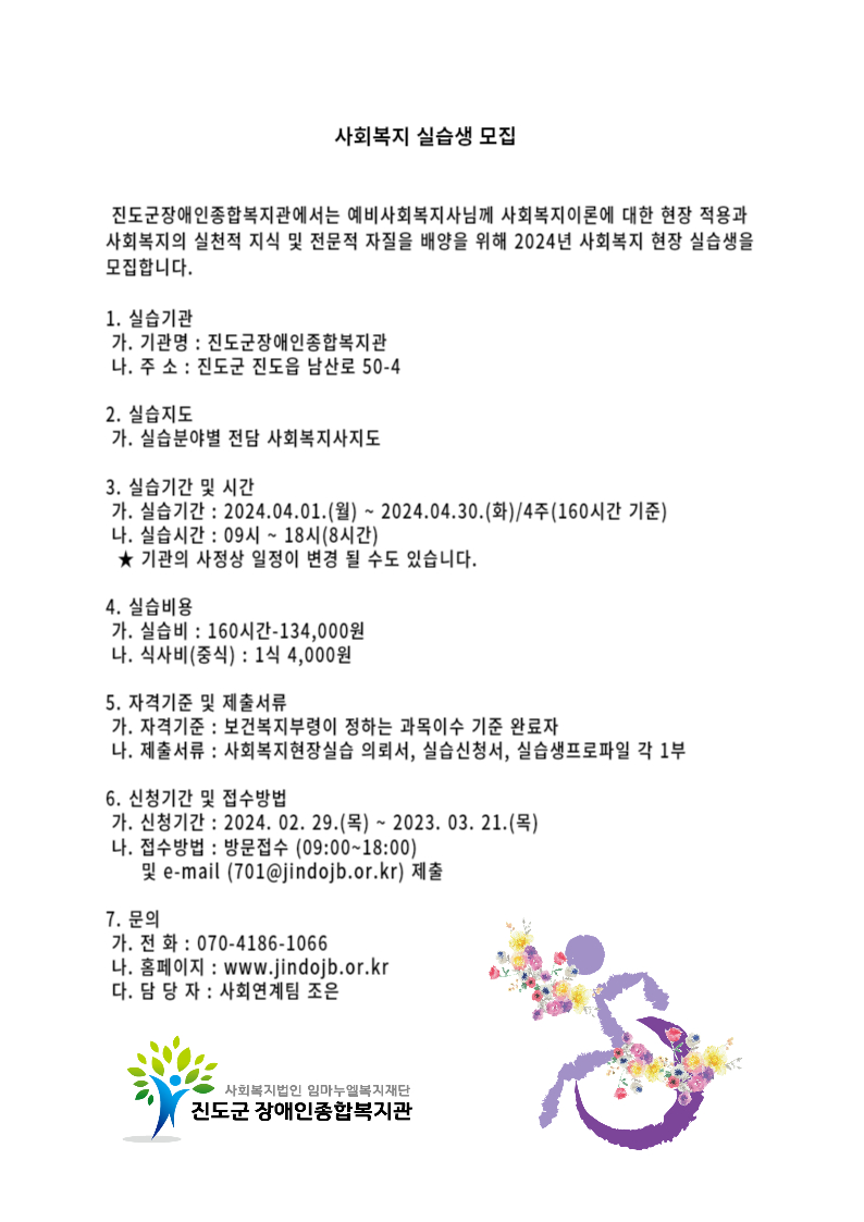 진도군장애인종합복지관 사회복지 현장실습생 모집