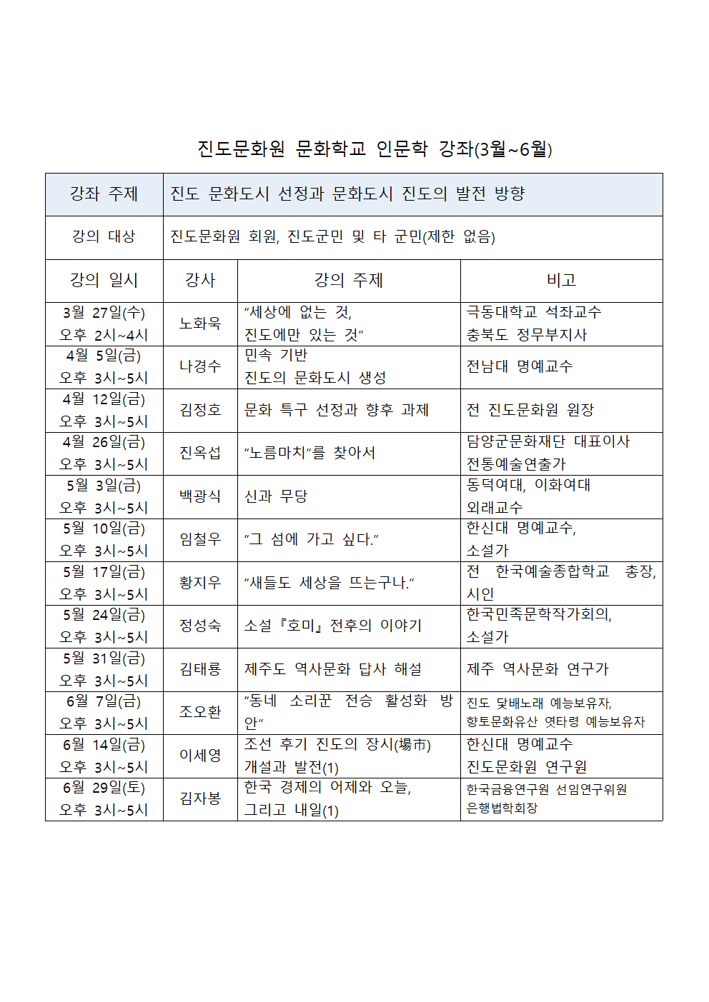 진도문화원 문화학교 인문학강좌 일 시: 24년4월5일(금) 오후 3시~5시(강사: 나경수 전남대 명예교수) 강 의 주제: 민속 기반 진도의 문화도시 생성 장 소: 진도문화원 2층 강당 많은 참석바랍니다