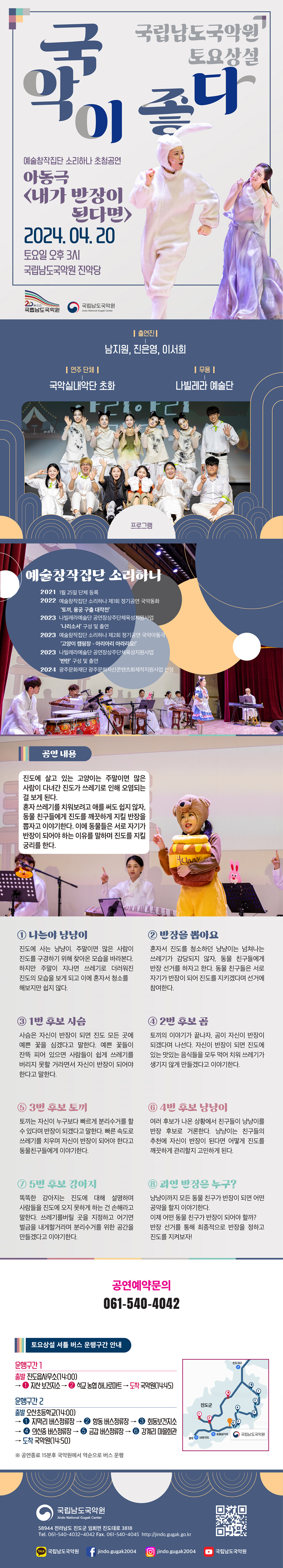 제목 [국립남도국악원] 토요상설 <국악이 좋다> 『예술창작집단 소리하나 초청공연 <아동극 “내가 반장이 된다면”>』