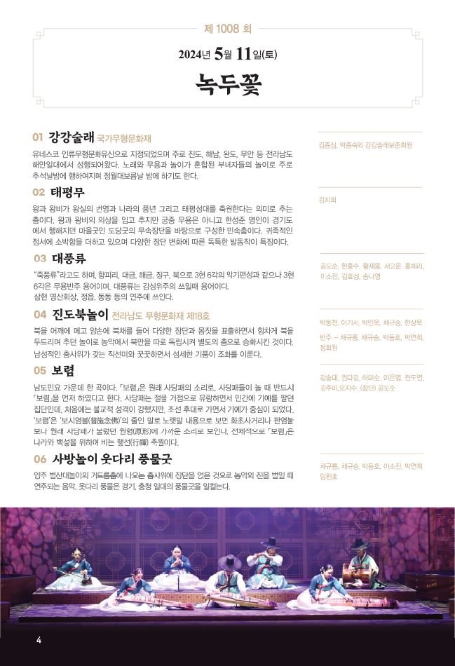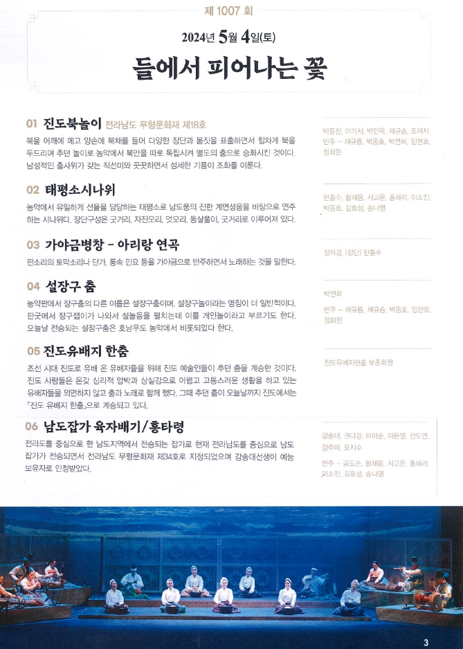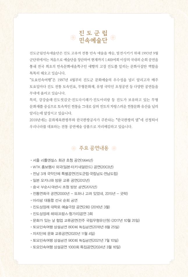 □ 공연개요 ○ 공연명: 진도토요민속여행 상설공연 ○ 공연일시: 매주 토요일 14:00 ~ 15:30 ○ 공연장소: 진도향토문화회관 대공연장 많은 관람 바랍니다.