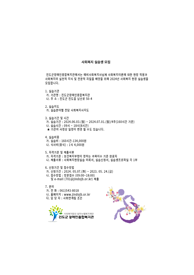 진도군장애인종합복지관 사회복지 현장실습생 모집