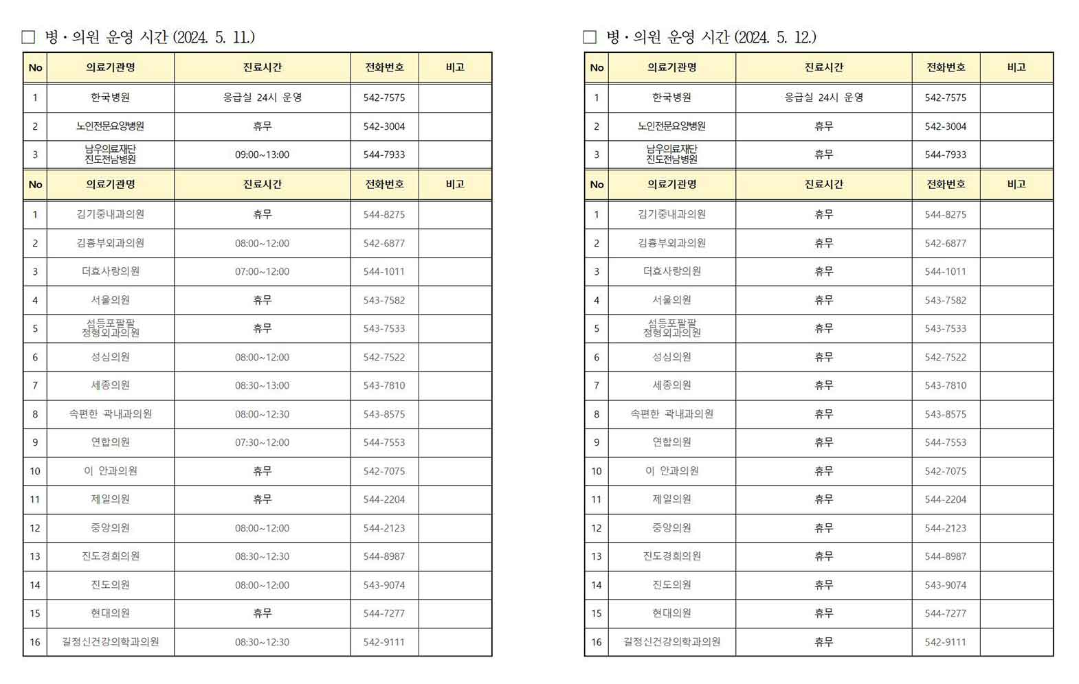 2024. 5. 10.(금) ~ 2024. 5. 12.(일) 병의원 운영시간 안내
