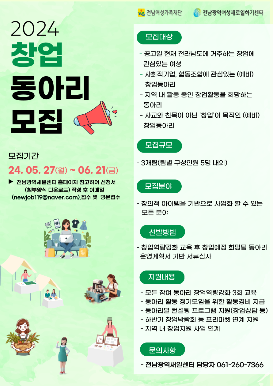 <<전남광역새일센터에서 창업동아리를 모집합니다.!!>> 모집기간 : ~2024. 6. 21.(금) 까지 지원방법: 전남광역새일센터 홈페이지 공지사항에서 신청서식 다운로드 후 이메일(newjob119@naver.com) 접수 제출서류: 창업동아리 신청서, 활동계획서 문 의: 전남광역새일센터 창업상담 061-260-7366