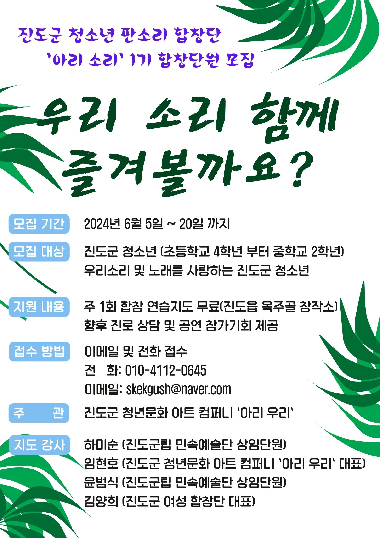 진도군 청소년들의 문화향유 기회를 제공하고자 진도군 청소년 판소리 합창단 아리소리 1기단원 분들을 모집합니다. 저희 아리소리와 함께 아름다운 추억 만들어봐요^^