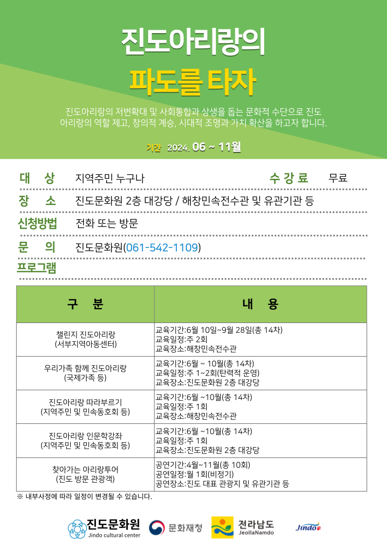 진도문화원에서는 진도군, 전라남도, 문화재청의 후원으로 '진도아리랑의 파도를 타자'를 주제로 아리랑 교실을 개설하며 음악회도 개최하니 많은 관심 바랍니다.