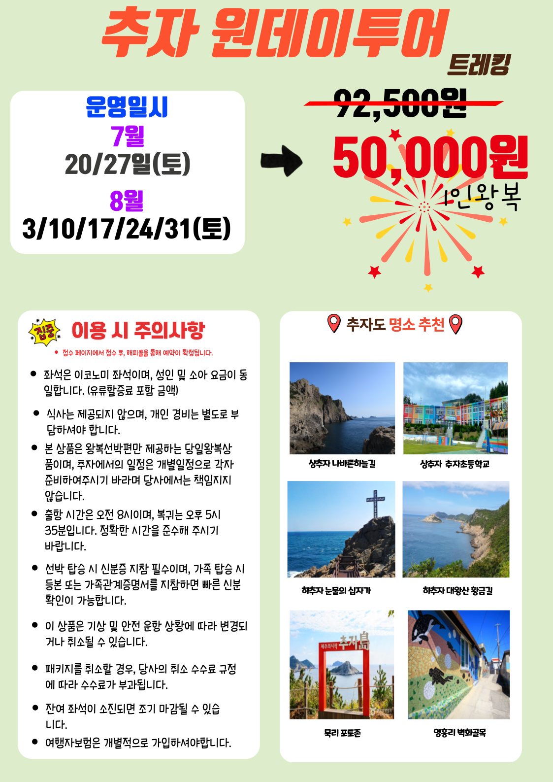 진도에서 출항하는 추자 왕복 원데이 패키지 특가 ! ! 코스는 강제가 아닙니다 ! 특가받고 추자에 콧바람 쐬고 ~ 추자의 상징 굴비도 맛보고 ! 가족과 지인과 이용할수있도록 매주 토요일에 진행하는 특가 이벤 ! 착한 금액에 추억까지 덤 ! ! 예약 문의는 070-8892-2985 로 전화주세용 !