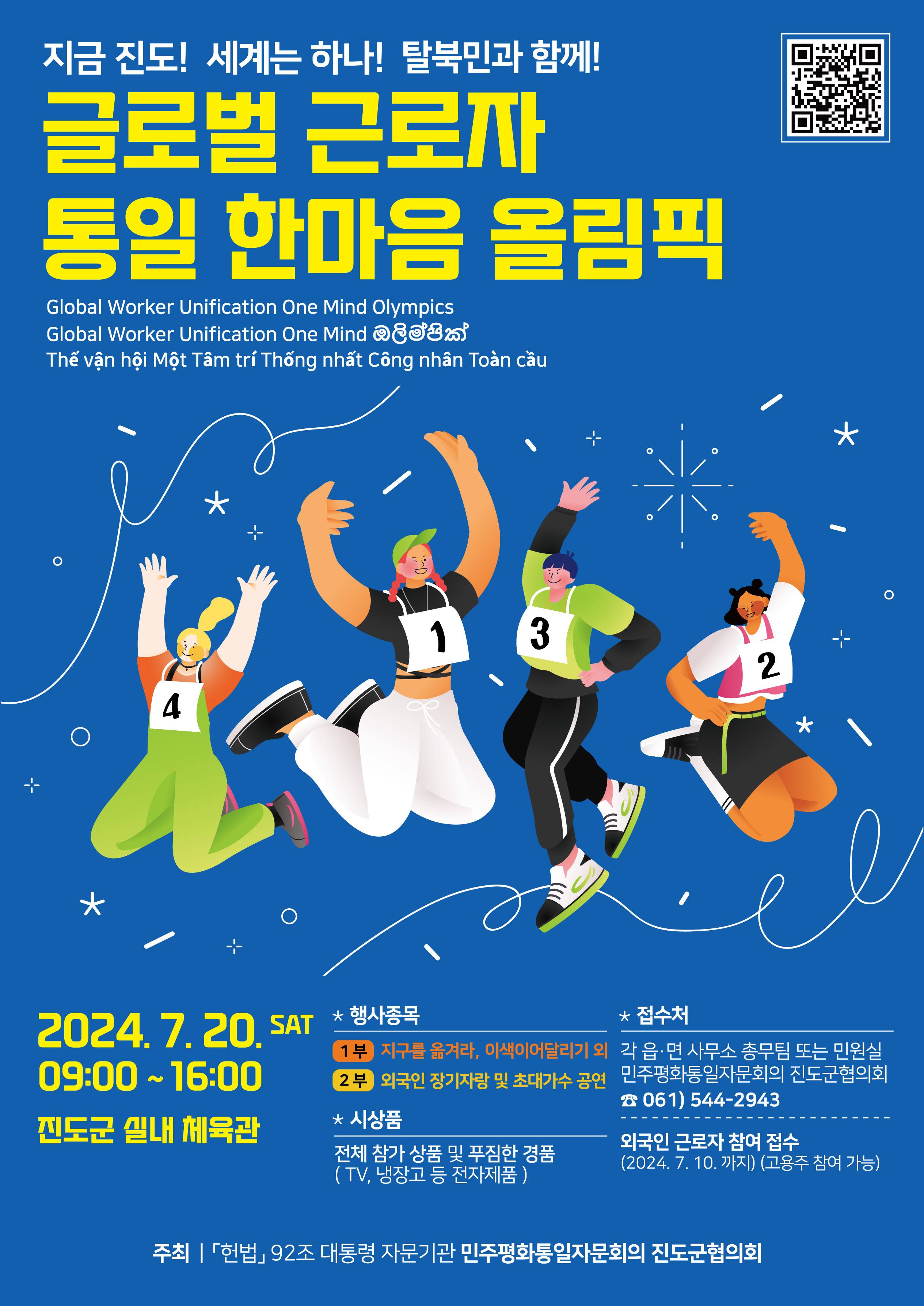 진도에서 외국인 근로자와 탈북민이 함께하는 통일 한마음 올림픽이 개최되다. | 상세 | 자유게시판 : 진도군청 페이지 링크 QR코드 URL:http://www.jindo.go.kr/home/sub.cs?m=20