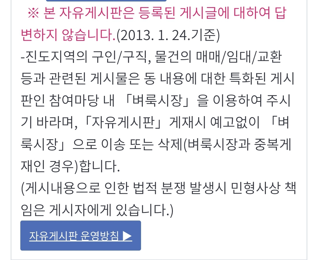 진도군 홈페이지 관리 담당자는 자기 본연의 임무에 충실히 임하시길 바랍니다. 게시판 운영 지침에 맞게 잘 지우고 관리하시길 바랍니다.