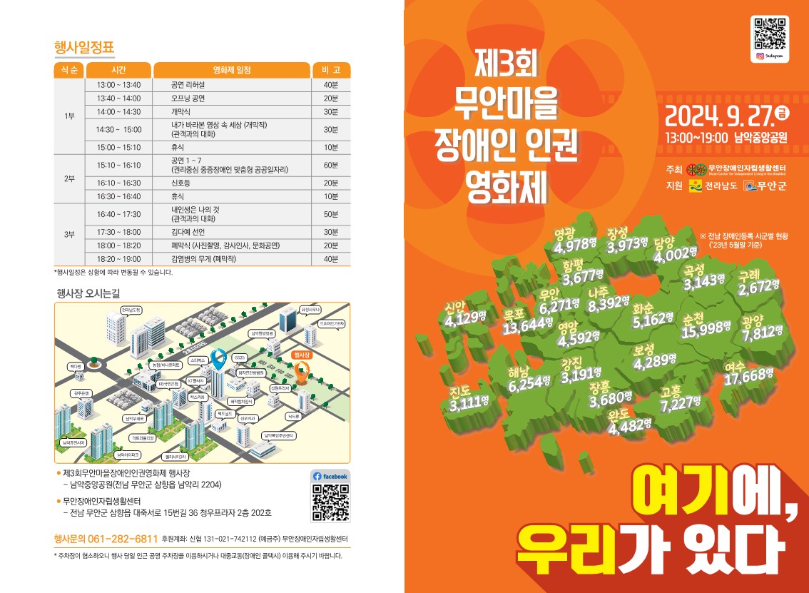제3회 무안마을장애인인권영화제가 2024년 9월27일 13:00 ~ 19:00에 남악중앙공원에서 개최됩니다.