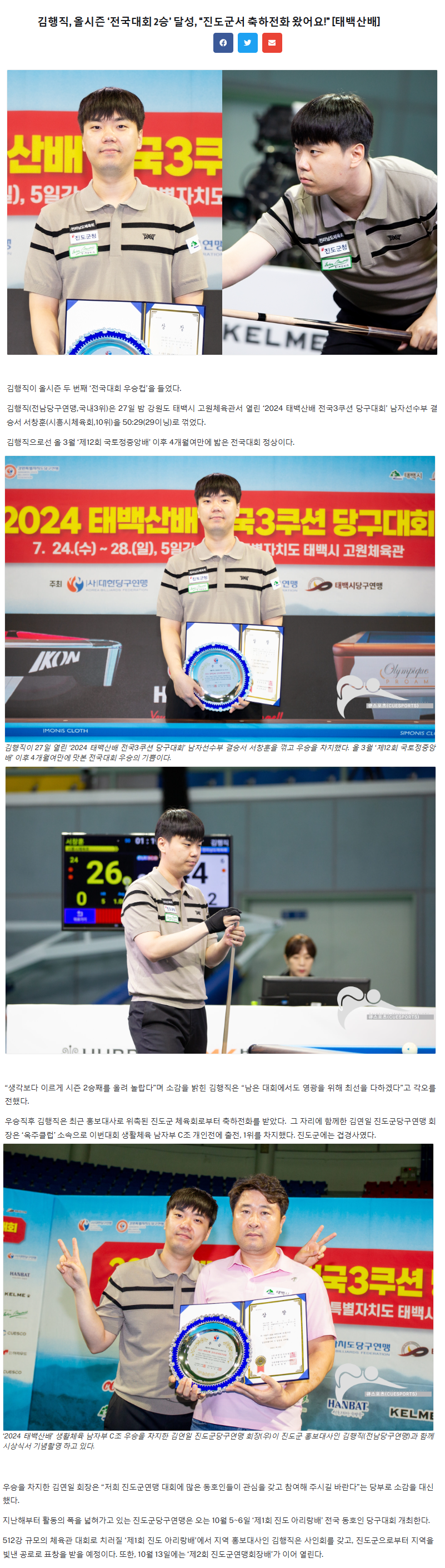 진도군청 소속 당구 김행직 선수 전국대회 2승 달성