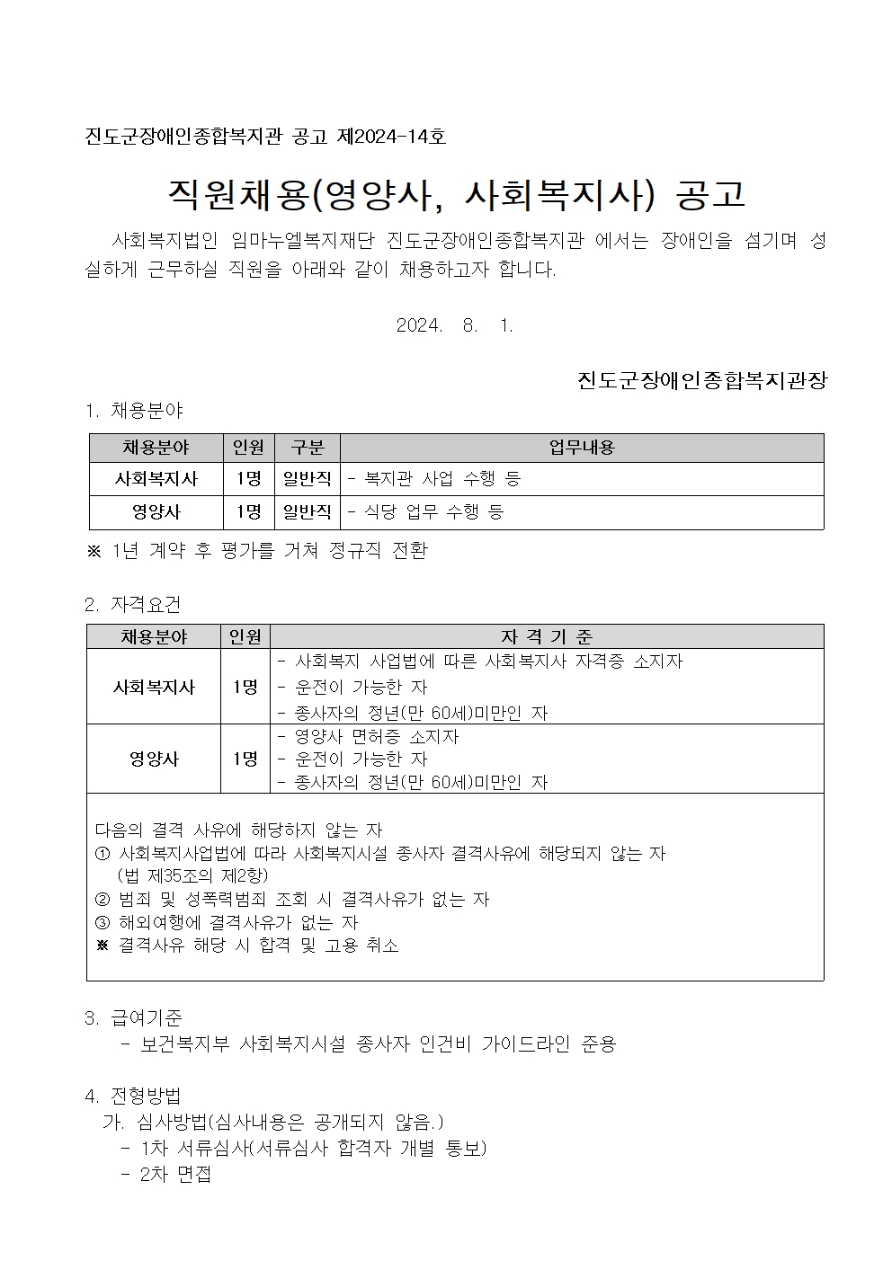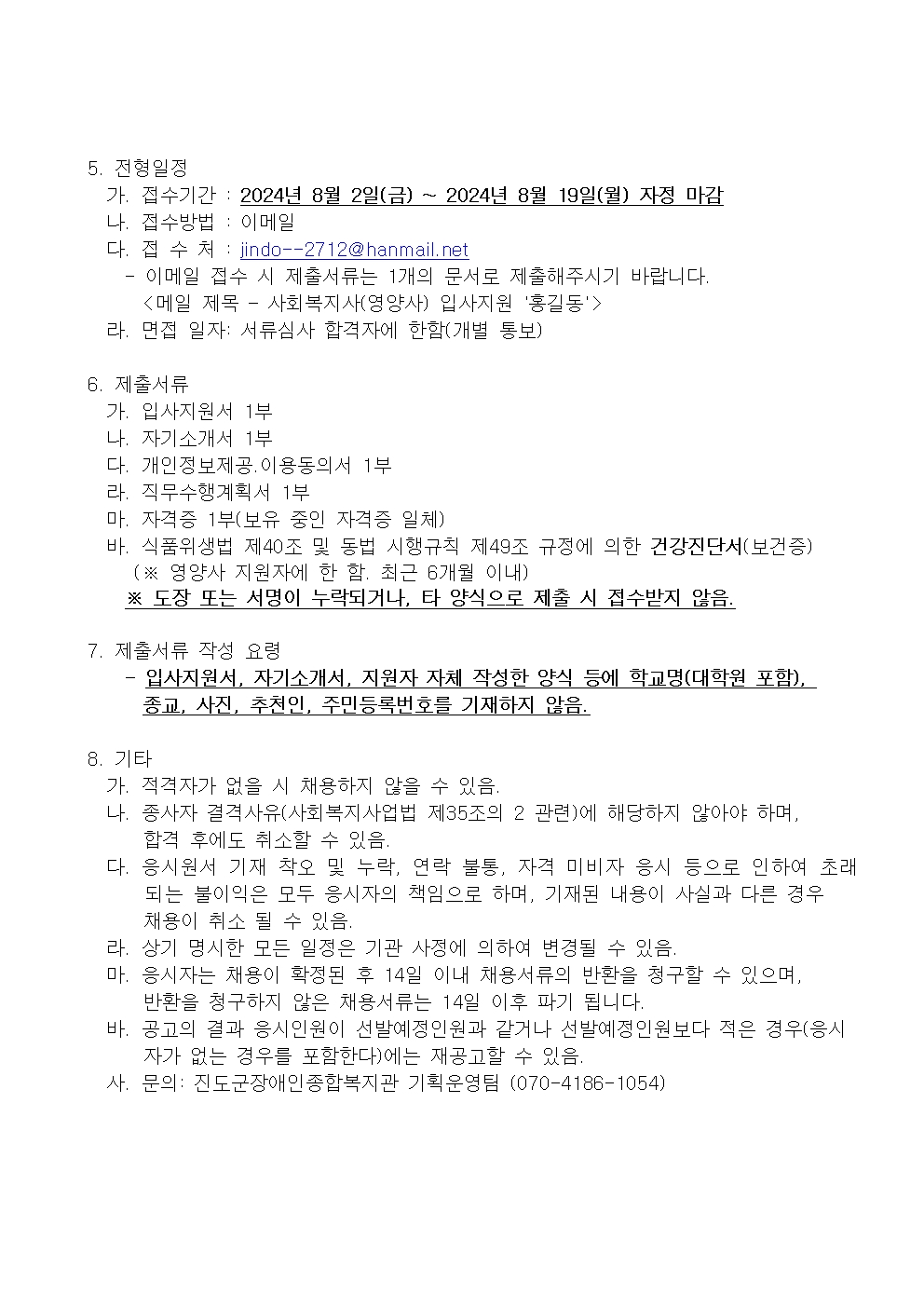 입사지원서 등 서식 파일은 아래 진도군장애인종합복지관 공지사항 링크를 확인바랍니다. http://www.jindojb.or.kr/sub/notice/notice.asp?mode=view&bid=1&idx=5522