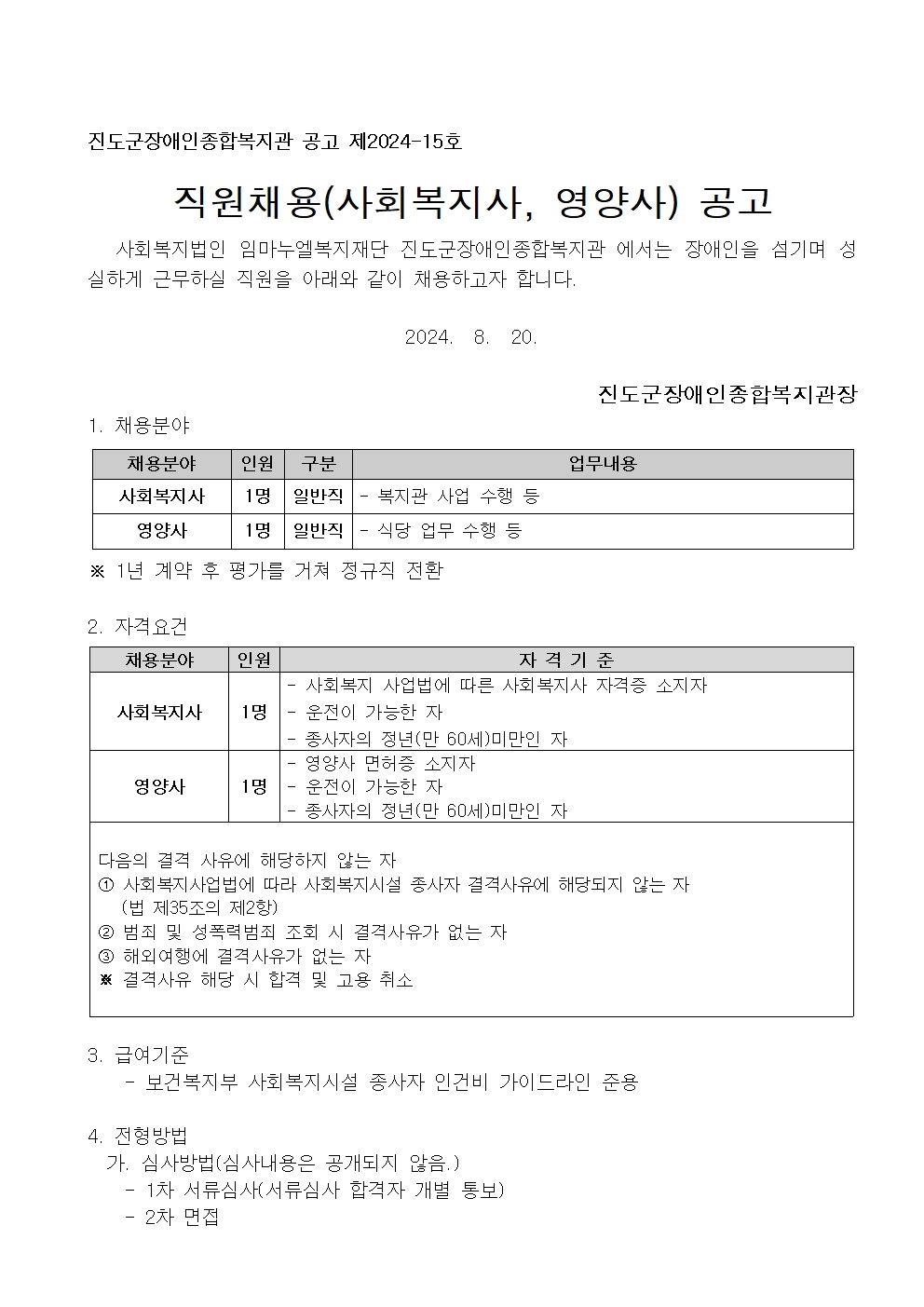 입사지원서 등 서류는 아래 진도군장애인종합복지관 링크를 통하여 확인하실수 있습니다. http://www.jindojb.or.kr/sub/notice/notice.asp?mode=view&bid=1&s_type=&s_keyword=&s_cate=&idx=5533&page=1