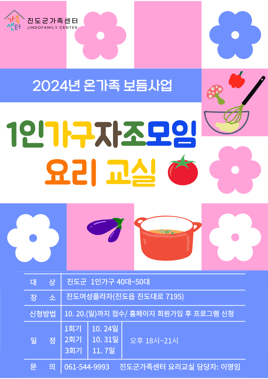 제목: 1인가구 자조모임 요리교실 장소: 진도군여성플라자 1층 조리실습실 대상: 진도군가족센터 1인 가구 회원 7명 선착순(인원 충원시 조기 접수 마감될 수 있음.) 신청: 진도군가족센터 홈페이지 회원가입 후 프로그램 신청 문의: 061-544-9993 담당자 이명임