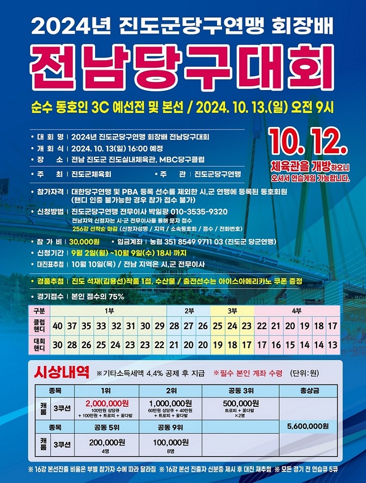 10월 13일 진도군당구연맹 회장배 전남당구대회가 실내체육관에서 열립니다~ 전남 동호인 여러분과 군민 여러분의 많은 관심과 성원 바랍니다~~