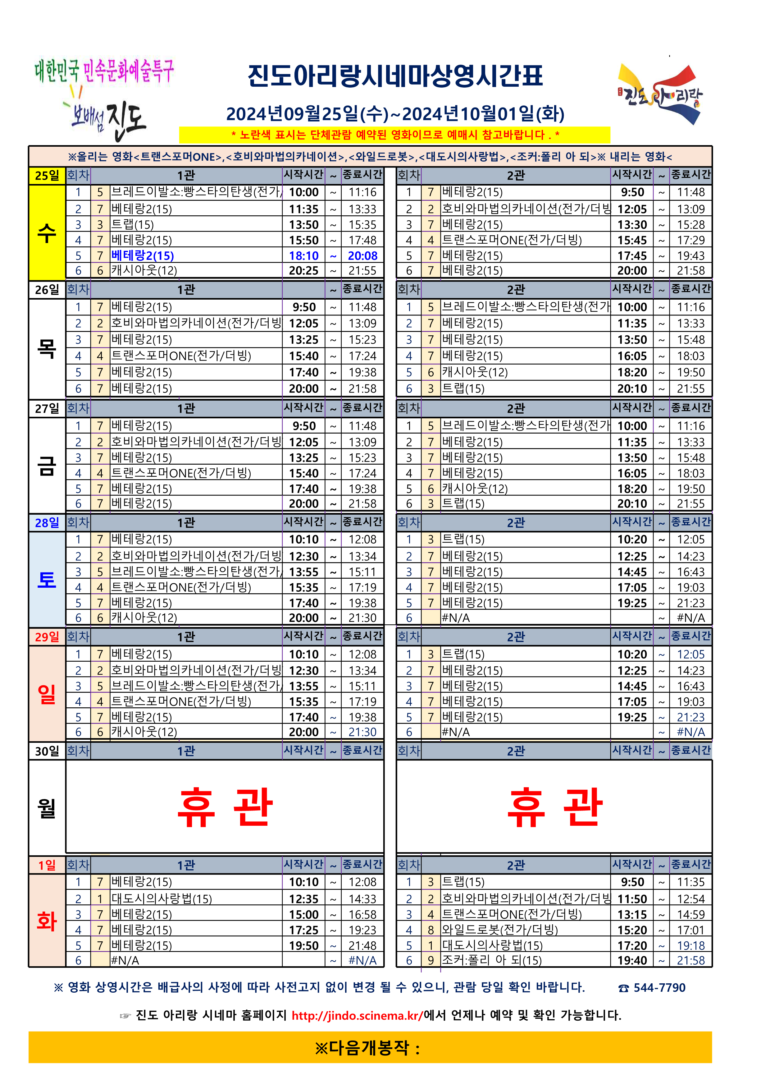 진도 아리랑시네마 상영스케줄<2024.09.25(수)~10.01(화)>안내드립니다.