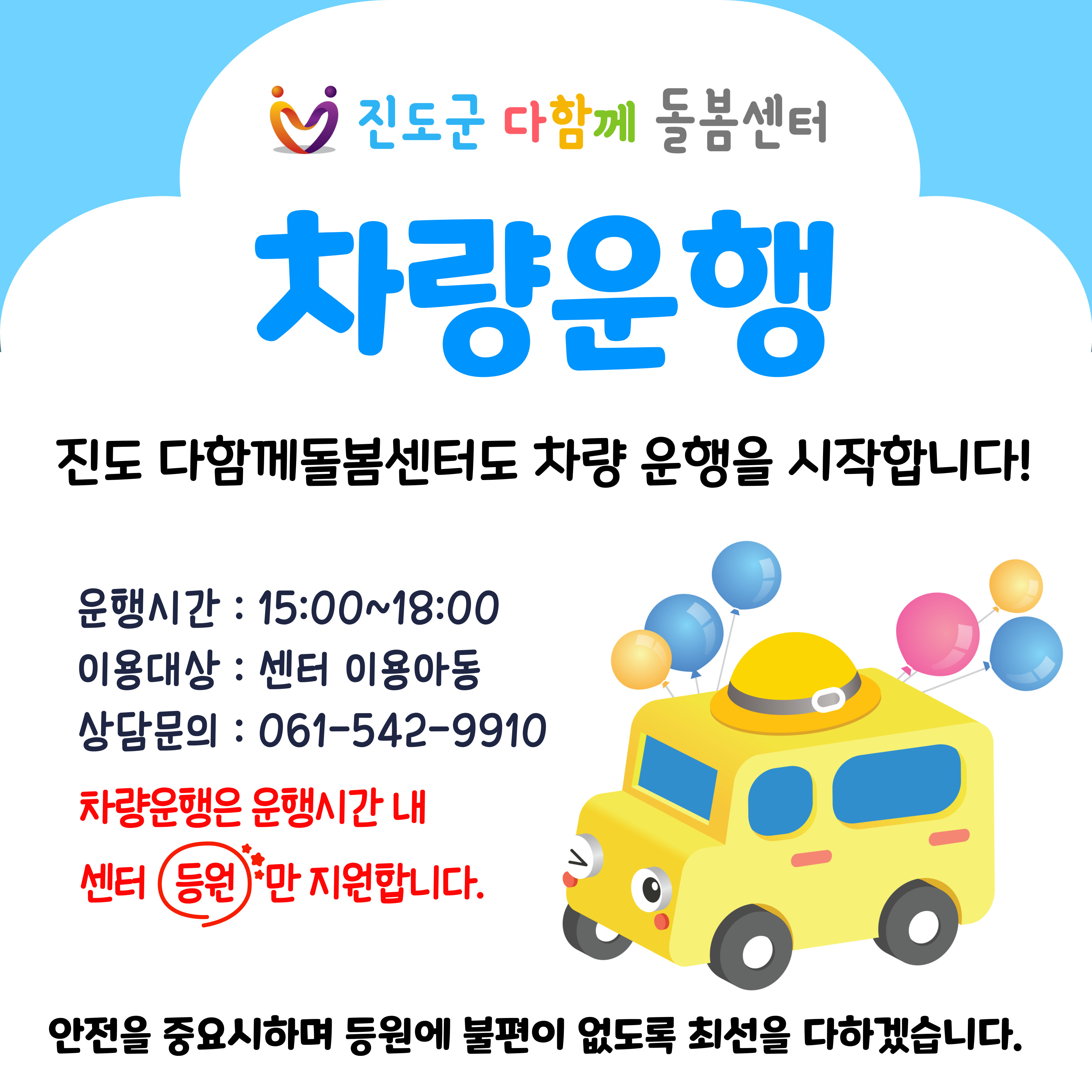 진도군다함께돌봄센터 차량운행 안내입니다. 10월 1일 부터 운행 예정이며 학부모님의 많은 관심 부탁드립니다.