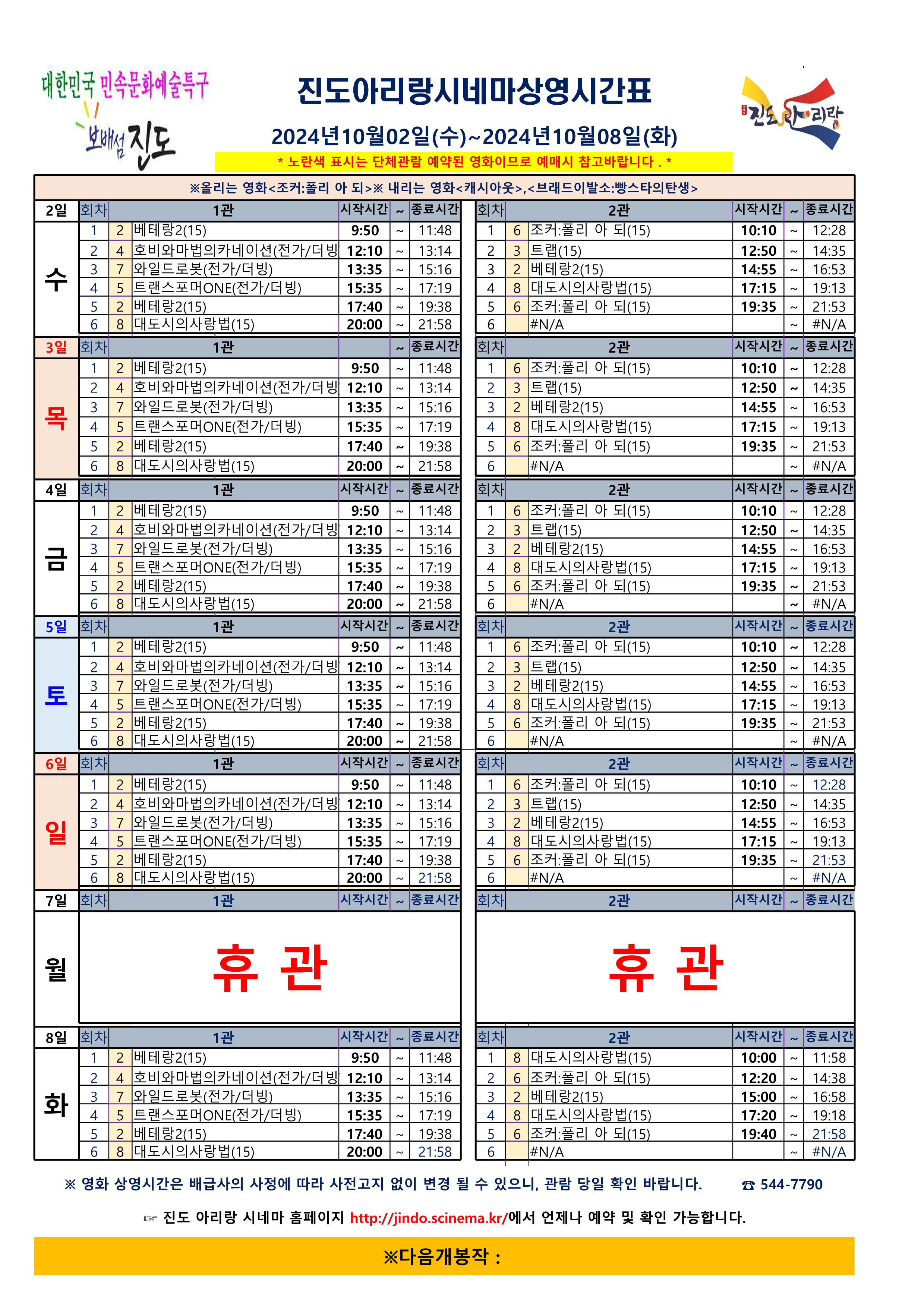 진도 아리랑 시네마 상영스케줄(2024.10.02(수)~10.08(화)안내드립니다.