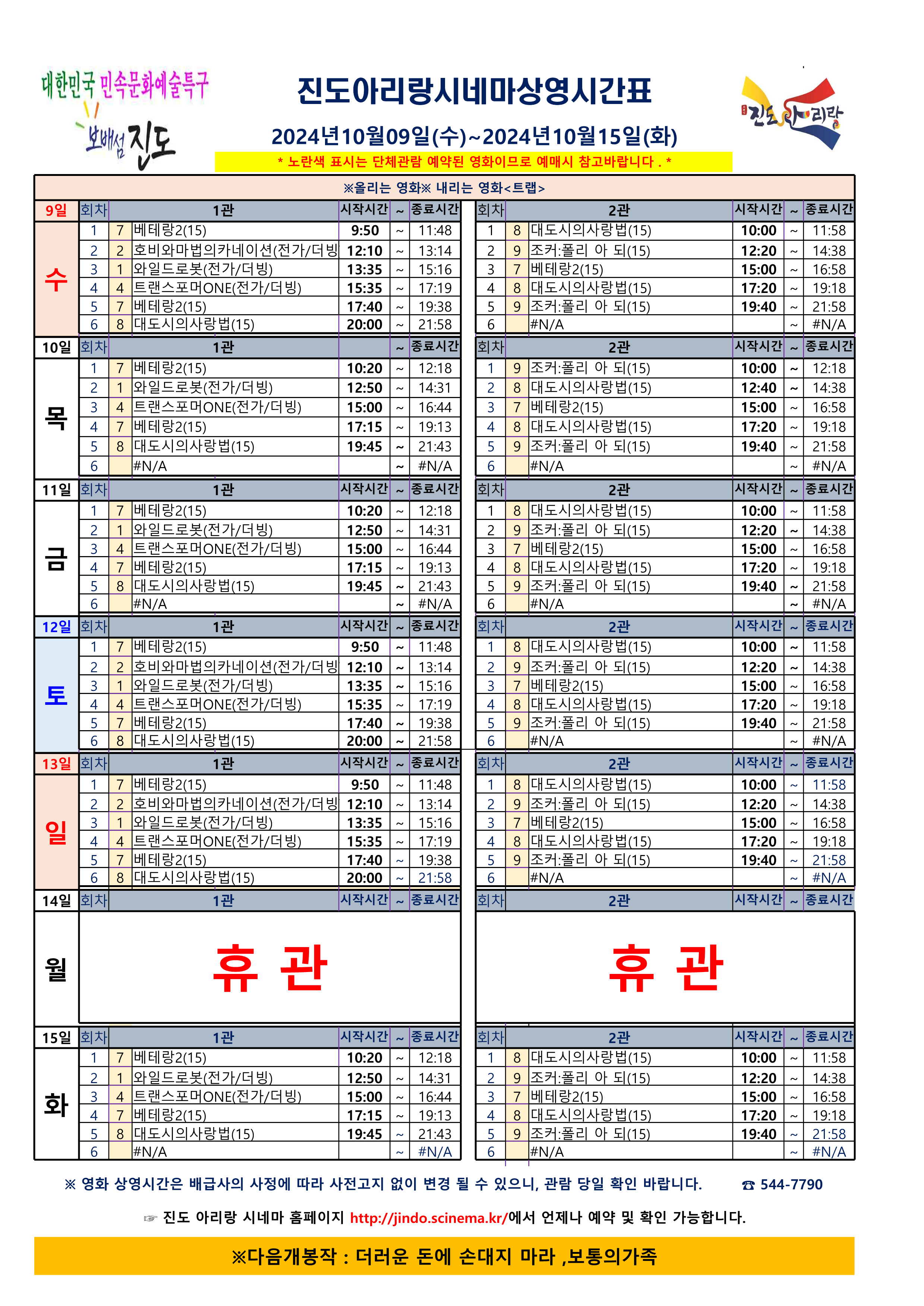 진도아리랑시네마 상영시간표<2024.10.09(수) ~ 10.15(화)> 안내드립니다.