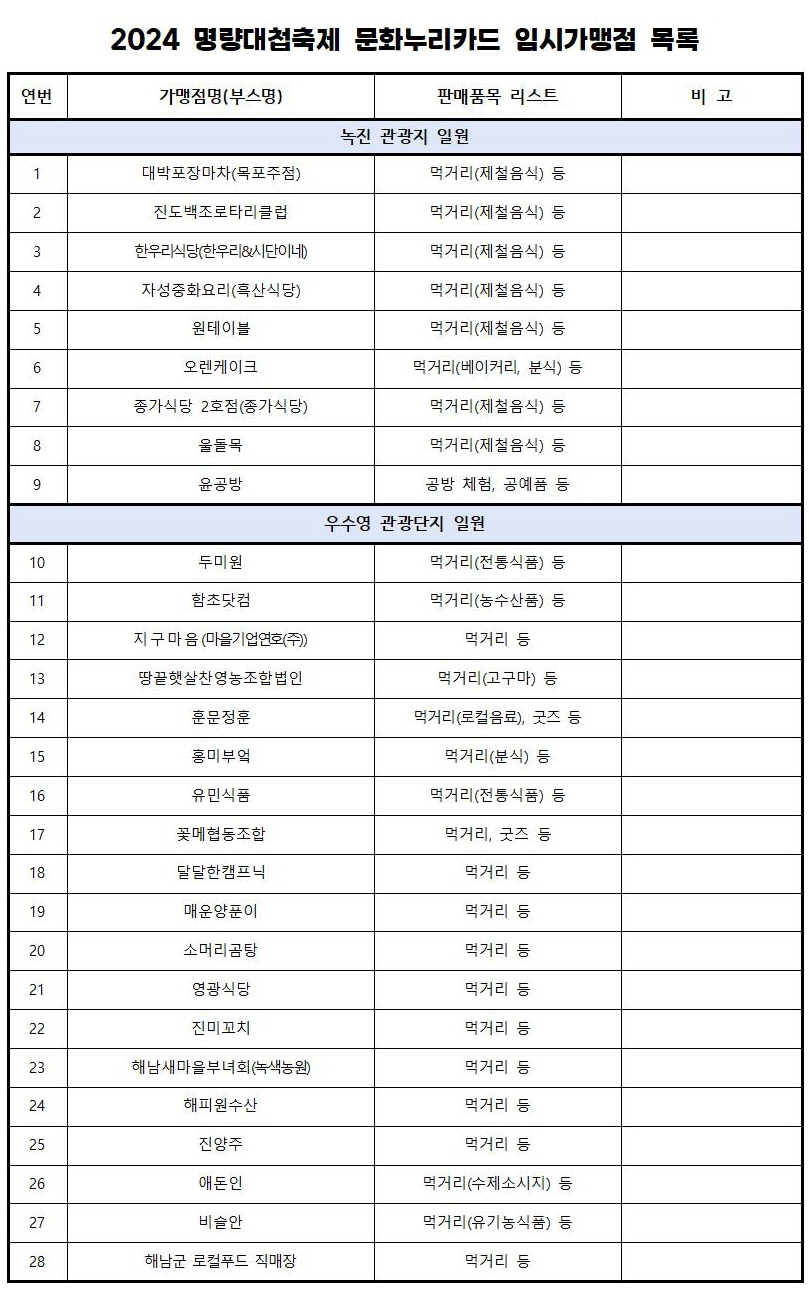 진도군 녹진관광지 9개 부스, 해남 우수영관광지 18개 부스에서 쓰실 수 있고