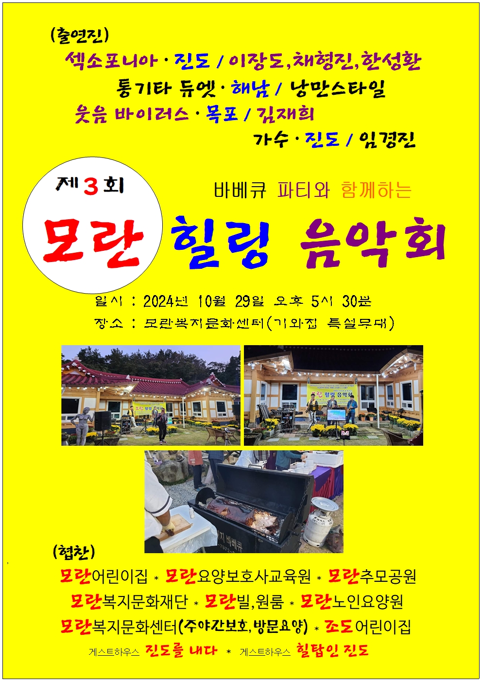 제3회 모란힐링음악회가 모란복지문화센터 기와집 특설무대에서 그동안 이장도회장님을 준심으로 한달에 한번씩 어르신들을 위해 수고 해 주신 여러분들과 수고하는 모란의 선생님들께 감사의 뜻으로 통 바베큐 파티를 겸한 음악회를 진행합니다. 시간내어 오시는 분들에게도 함께 바베큐와 식사를 함께 할 수 있습니다.