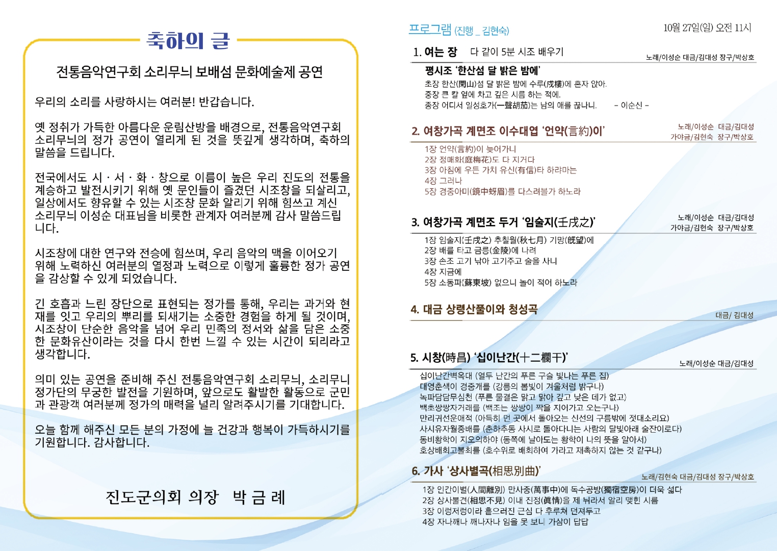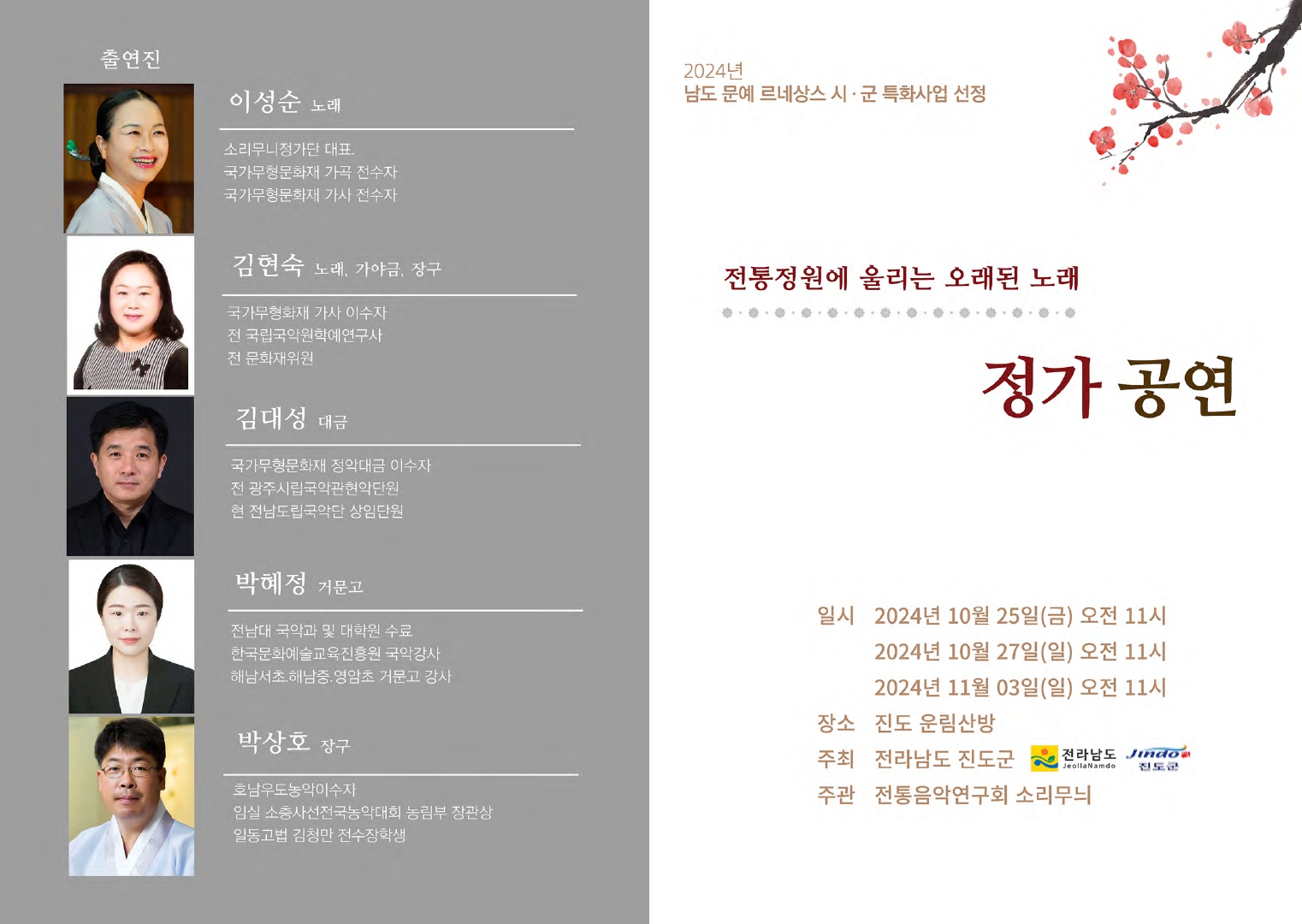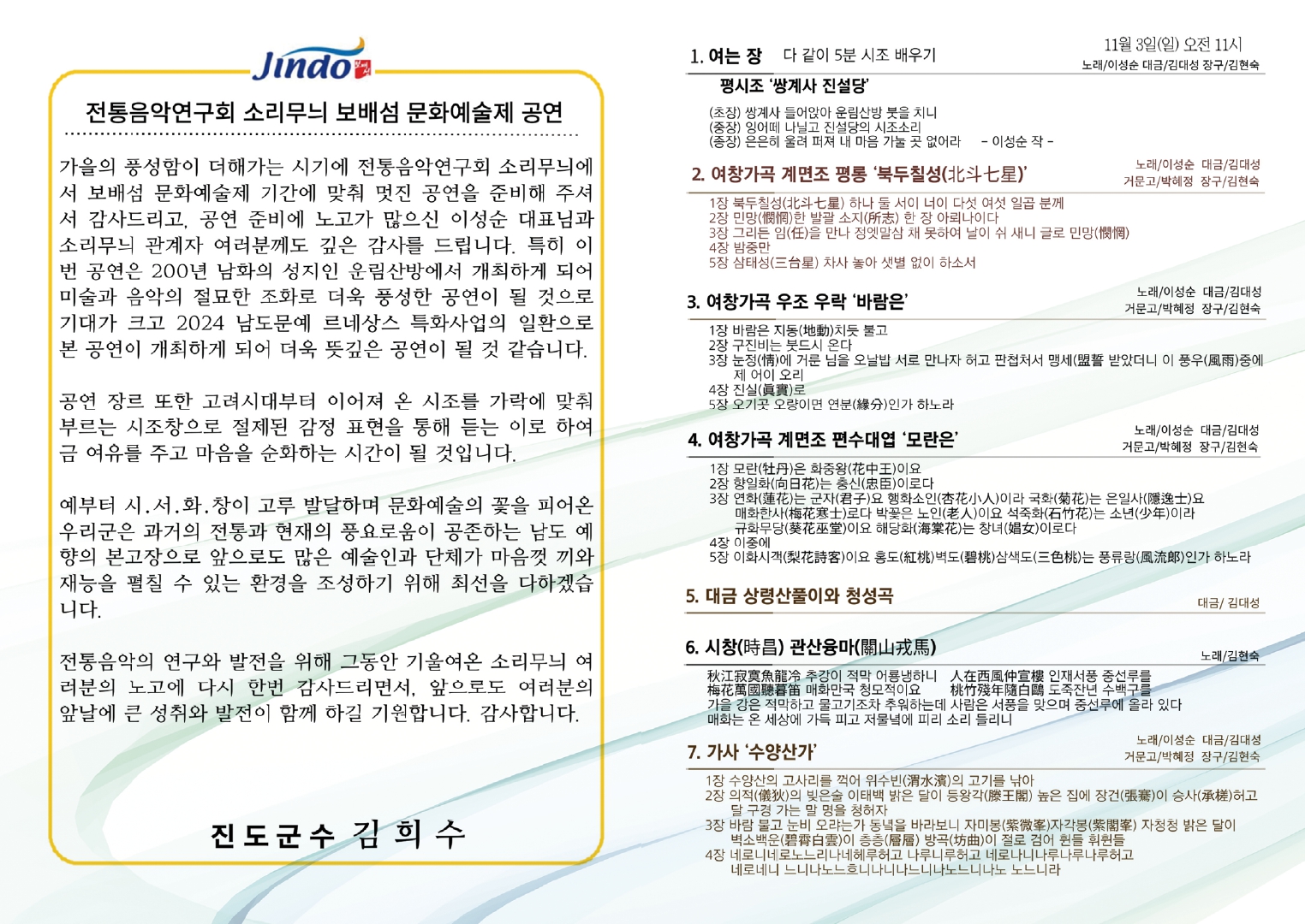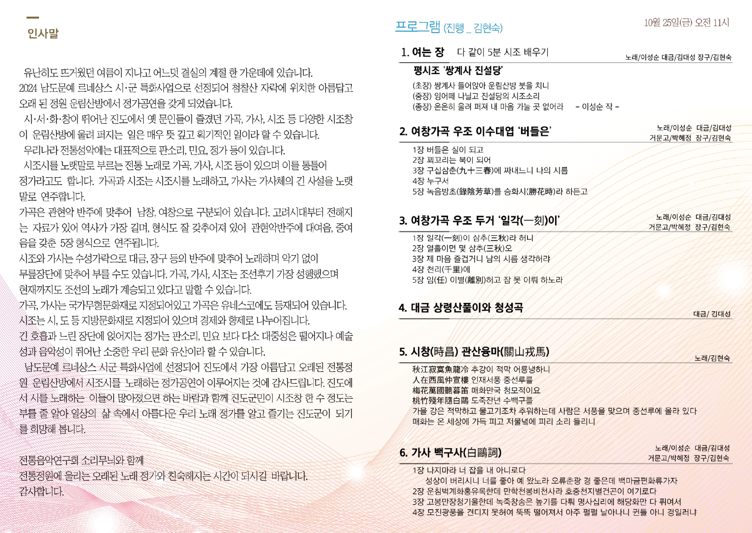 □ 전라남도 남도문예 르네상스 시군 특화사업 '전통정원에 울리는 오래된 노래 정가 공연' 안내 ○ 일시 : 10. 25.(금) 11:00 / 10. 27.(일) 11:00 / 11. 3.(일) 11:00 ○ 장소 : 진도 운림산방 ○ 내용 : 정가(가곡, 가사, 시조, 대금) 공연