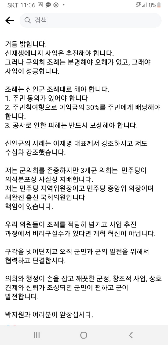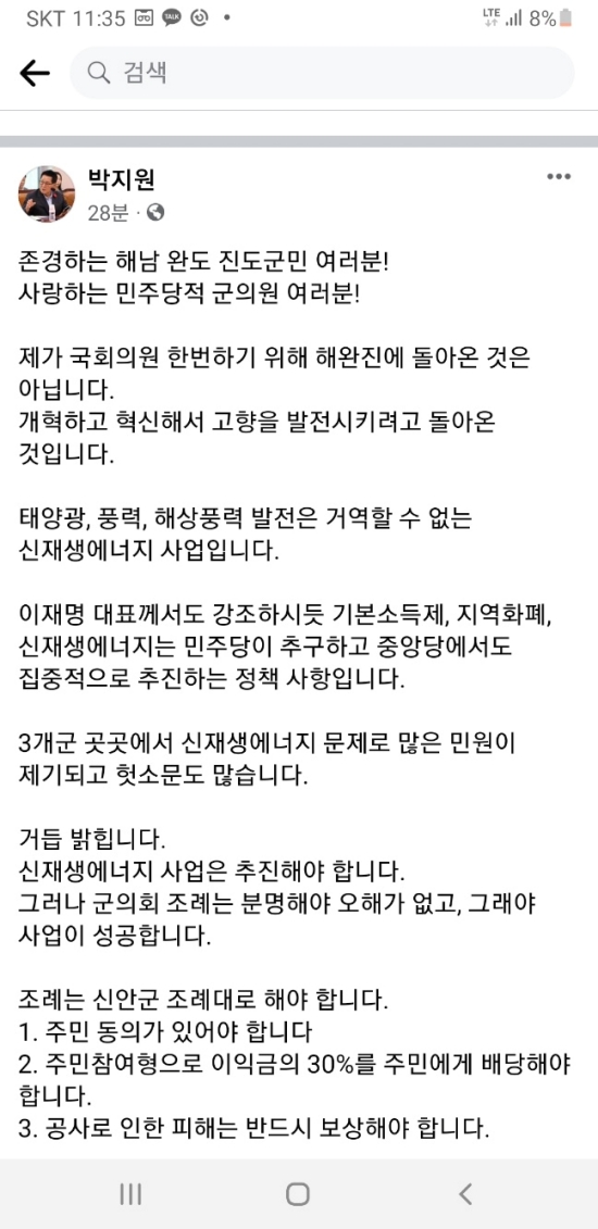진도 해남 완도 국회의원 박지원 님께서 어제 밤 11시경 페북에 풍력조례관련 남기신 글입니다.