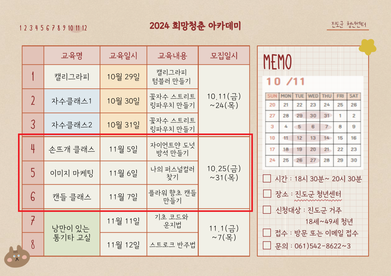 2024희망청춘아카데미 2주차!! 원데이클래스 과정!! 이번주는 손뜨개클래스, 이미지마케팅, 캔들클래스 ※ 신청서는 고시공고에 "희망청춘아카데미" 검색하시면 신청서가 있습니다! 많은 관심과 참여를 바랍니다!