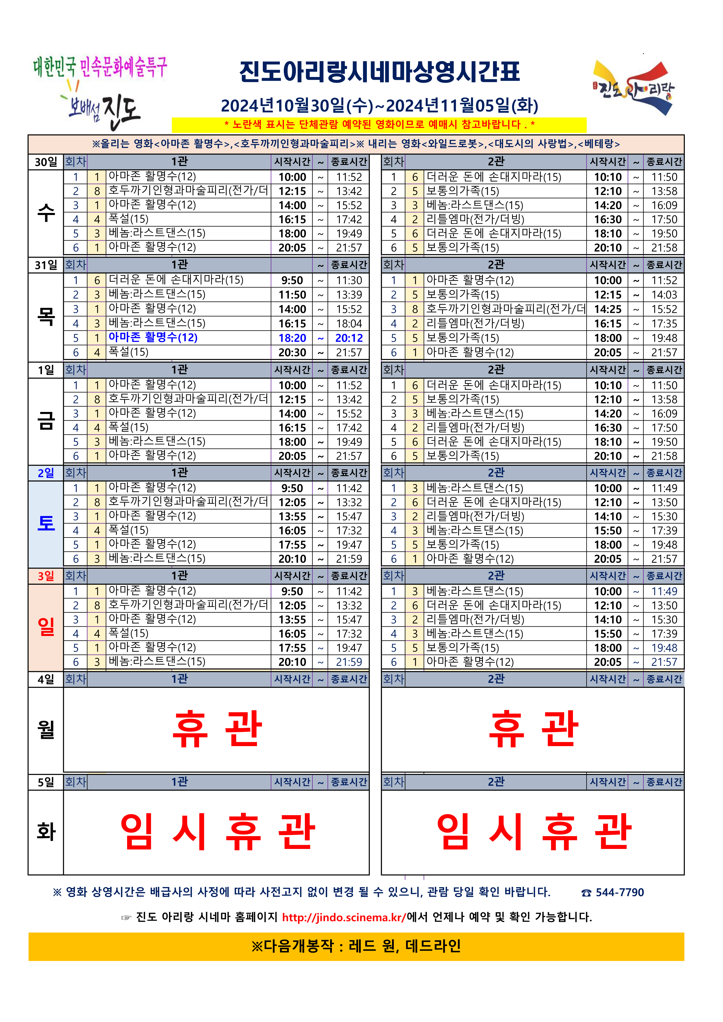 진도아리랑시네마 상영시간표 <2024.10.30(수)~11.05(화)> 안내드립니다.