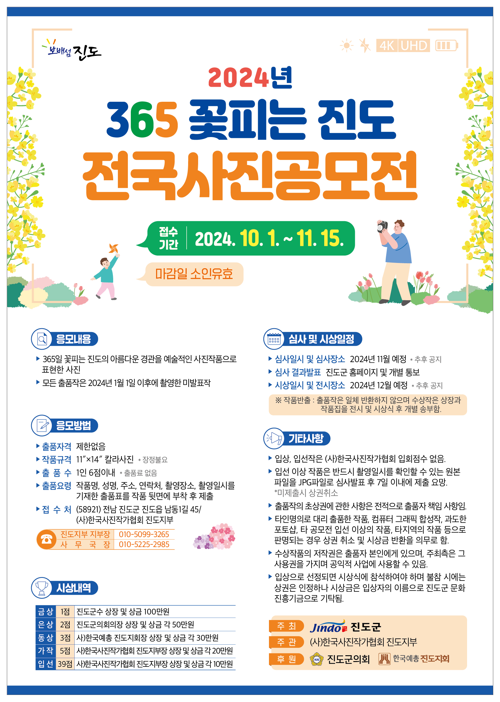 (사)한국사진작가협회 진도지부에서는 「365 꽃피는 진도 전국사진공모전」을 추진하고 있습니다. 군민 여러분께서는 365일 꽃피는 진도의 아름다운 경관을 찍은 사진을 많이 응모해 주시기 바랍니다.
