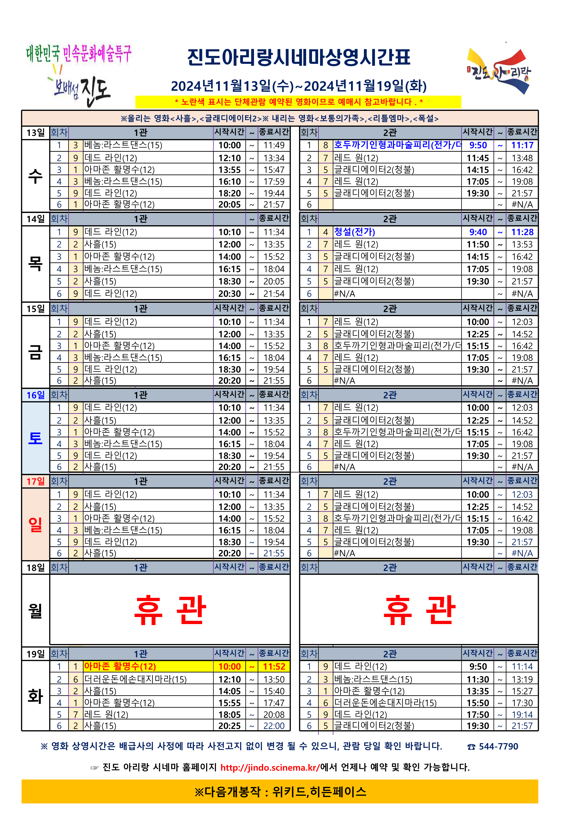 진도 아리랑 시네마 상영시간표 <2024.11.13(수) ~ 11.19(화)> 안내드립니다.